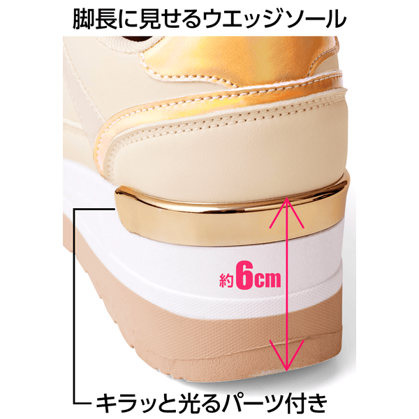 足長:23.5cm/ワイズ:EE/試着サイズ:L/特徴:やや幅広・甲高- 足長効果のあるウエッジソールで、足首までホールド感もあるため安定感があって歩きやすいです。さりげなくキラッとした靴紐でスニーカーながらカジュアルになり過ぎないのも良いです。