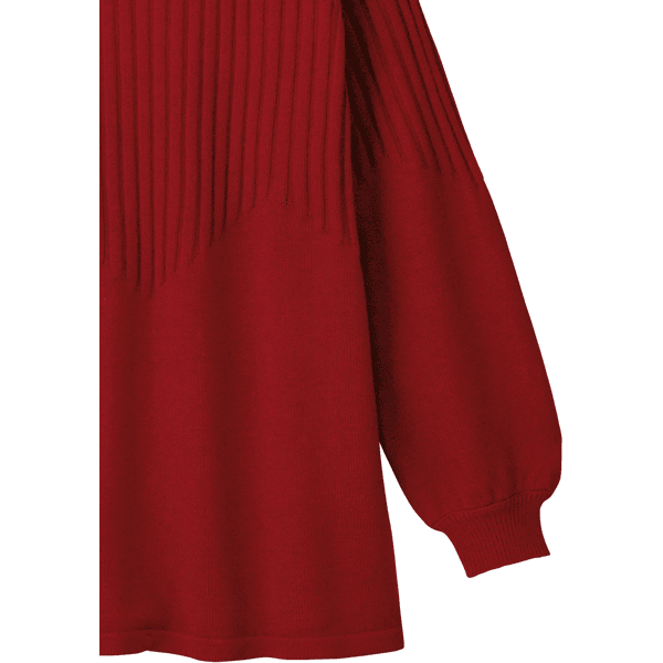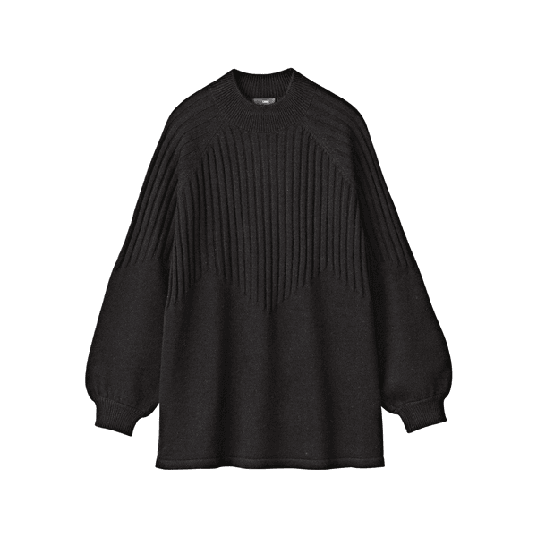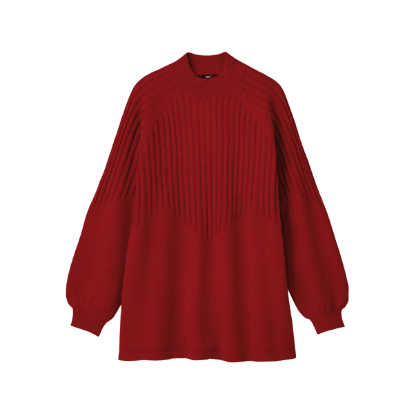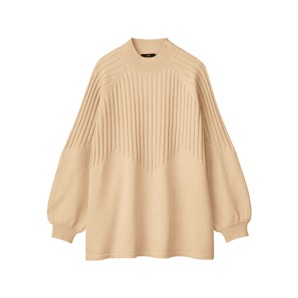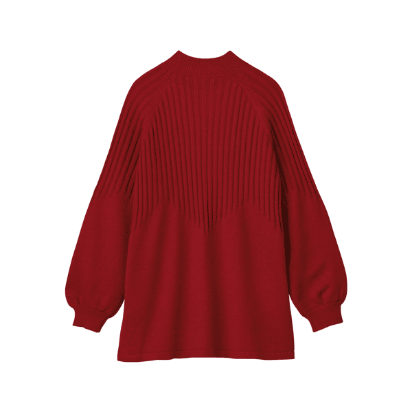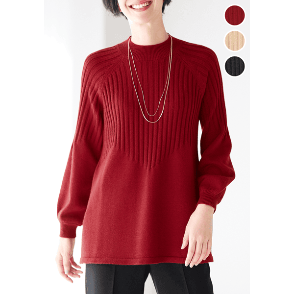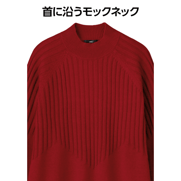 リブとフレアの組み合わせで細見えするニット。ウエスト高めの位置でジグザグ状に切替えることでスタイルアップし、くびれもつくります。お腹まわりをしっかりカバーするのも◎。