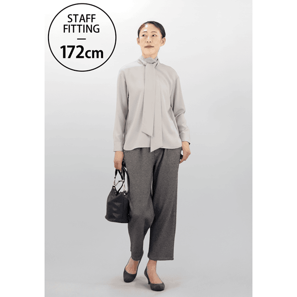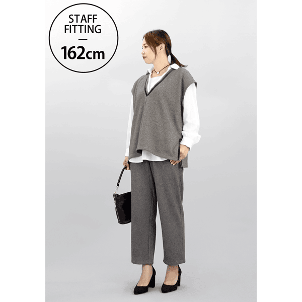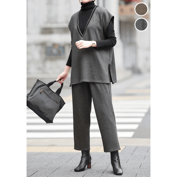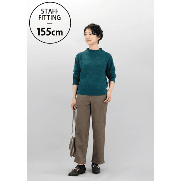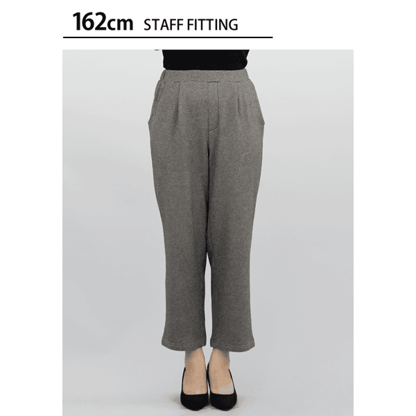 ツイードの風合いをジャージー生地で表現!伸縮性が高く裏はふんわりしたシャギーで、あたたかくラクな履き心地。低身長さんもおすすめのクロップド丈のパンツです。