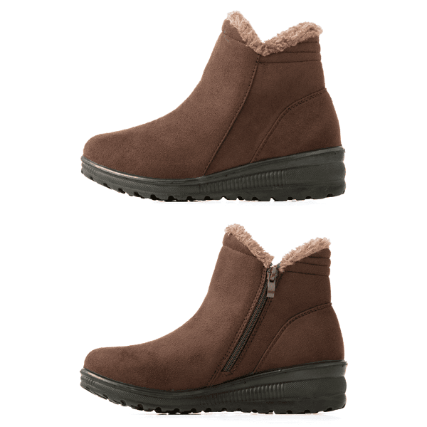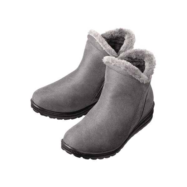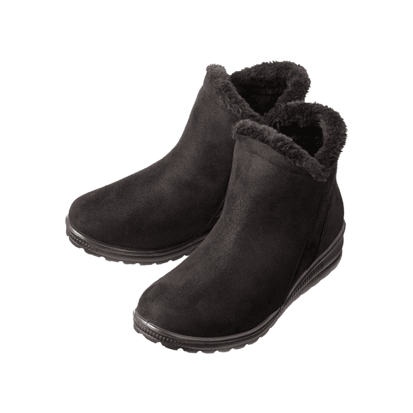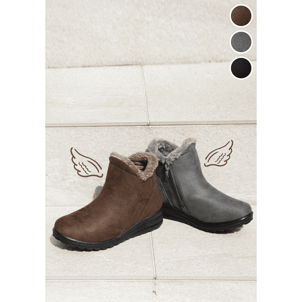 サイドファスナー開閉で脱ぎ履きラクなショートブーツ。内側は履き口からつま先まで厚手のボアで、足にぴたっと密着してあったかです。本体は起毛したフェイクスウェードでぬくもり感がありながらも上品な印象に。