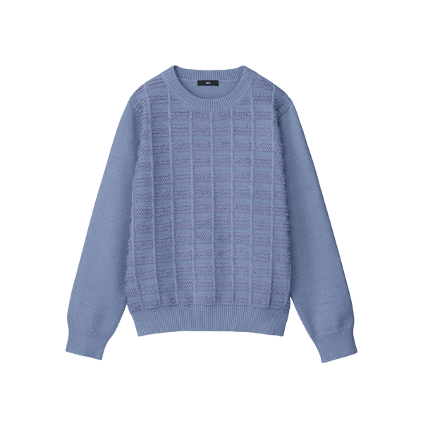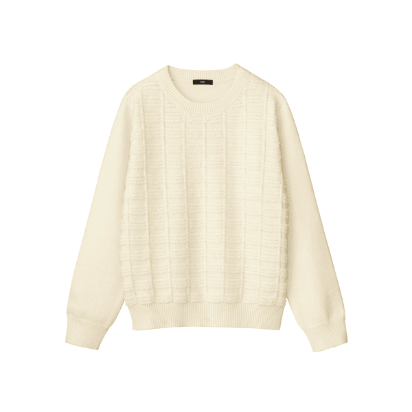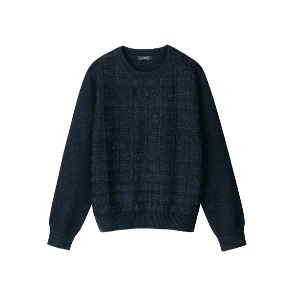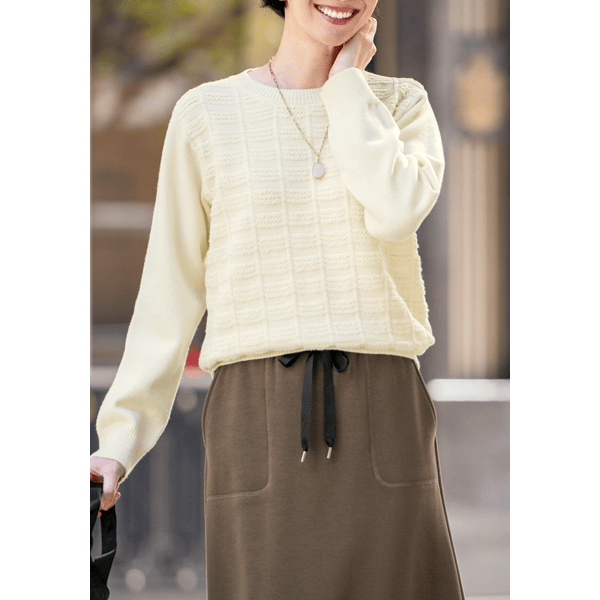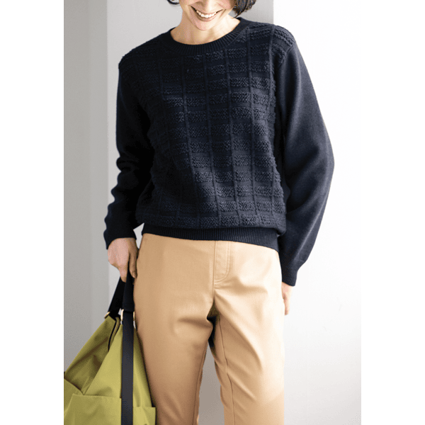 目のつまった厚みのある編み地と吸湿発熱機能であたたかい、立体感のあるチェック柄が華やかなニット。ほどよいゆとりでボディラインをひろいにくく、オンオフで着られます。