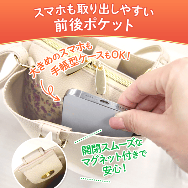 • 仕様/開閉:ファスナー式 ショルダー:長さ調節可・取り外し不可 前面:マグネット付きポケット 中面:オープンポケット×2・Dカン付き 背面:マグネット付きポケット