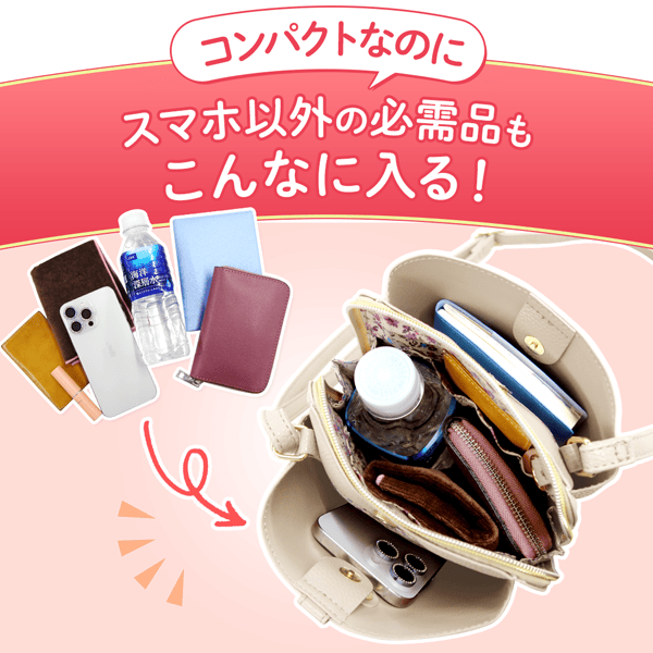 ペットボトル、長財布、スマホ、本当に何でも入ります!写真の通りでこんなにコンパクトなのに必要な物は全て入ります!不思議です!裏地もかわいいし、色もどれもいい!無難にアイボリーと黒を買いましたが他の色も検討中です!買い過ぎかな、、