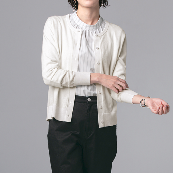 ほどよいゆとりでレイヤードしやすい上品カーデ。肌ざわりがよく、とても着心地がよいです。