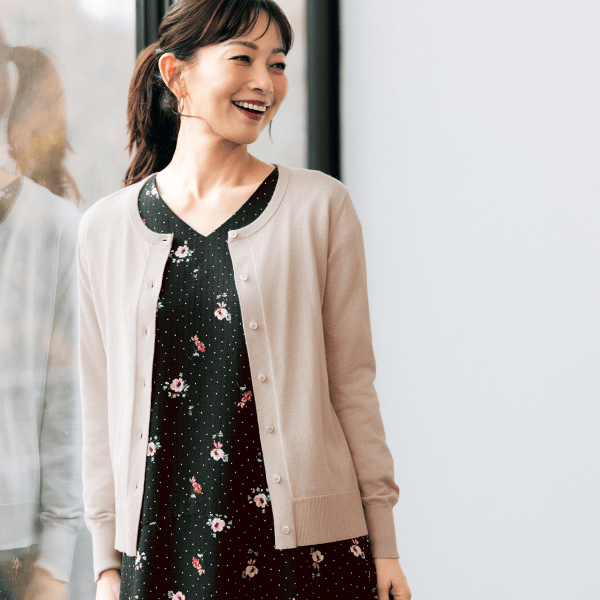 ほどよいゆとりでレイヤードしやすい上品カーデ。肌ざわりがよく、とても着心地がよいです。
