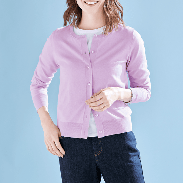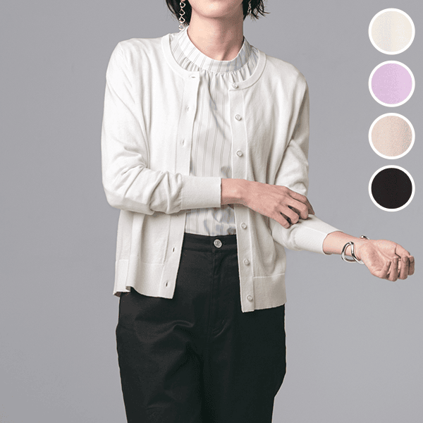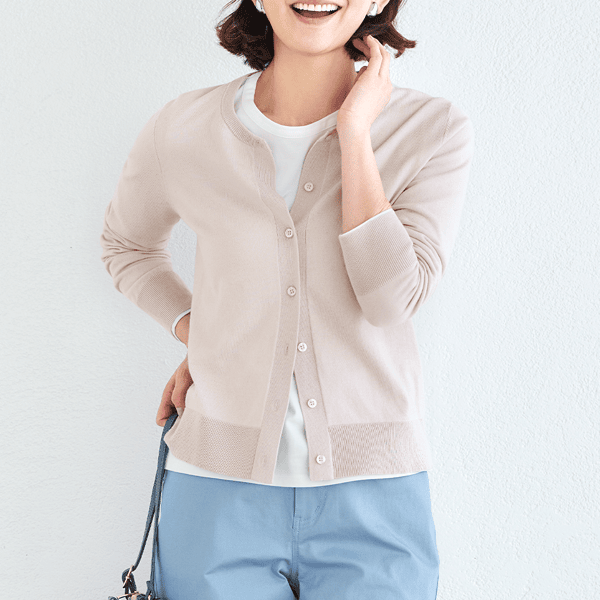 ほどよいゆとりでレイヤードしやすい上品カーデ。肌ざわりがよく、とても着心地がよいです。