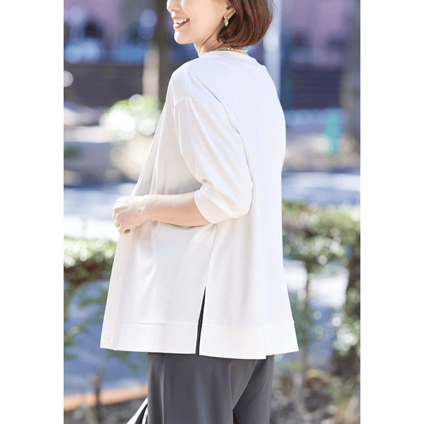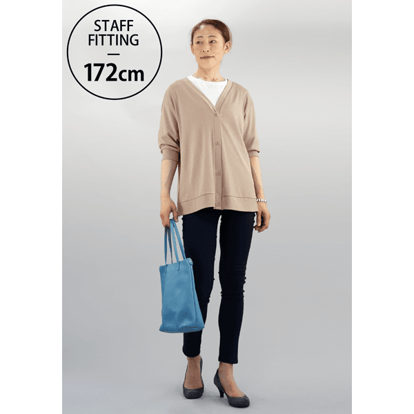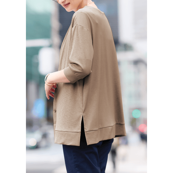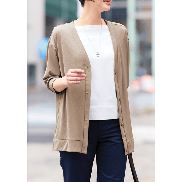 リラックス感のあるシルエットでオンオフ着回せるカーディガン。ドレープ感のある生地と長め丈で、すっきり着られます。シワが付きにくく、たたんで持ち運ぶのにも便利です。