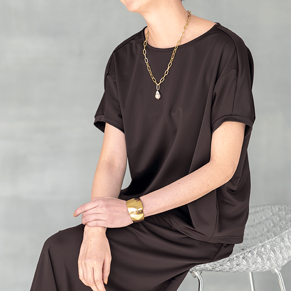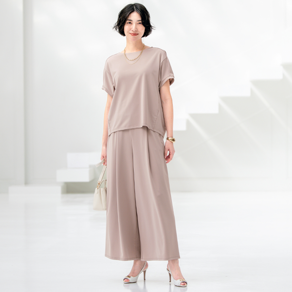上品な微光沢感があり美しく、ドレープ性も高いので、しなやかに大人のエレガントさを醸します。また、シンプルなデザインながらも体型の気になるところもすっきり隠し、すらりとした印象をつくります。単品でも着回しやすいですが、セットアップで着るとさらにその効果は上がり、スタイリッシュにキメられ、この夏の着こなしで大いに活躍します!