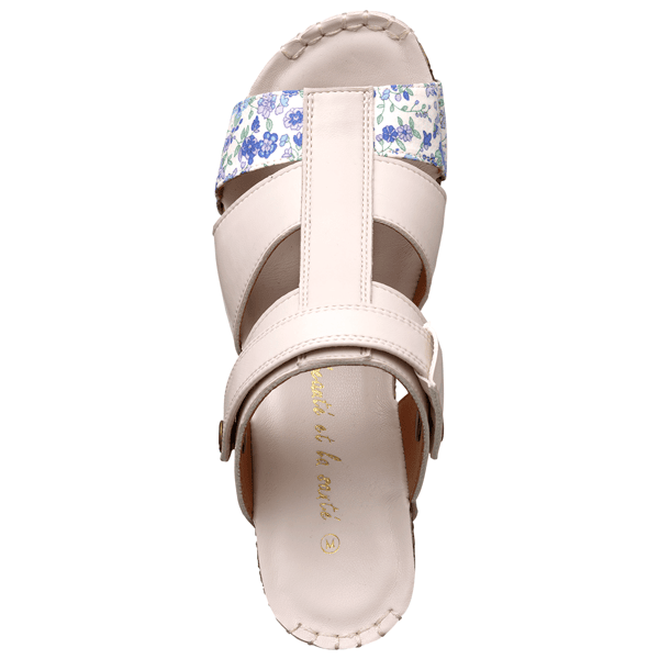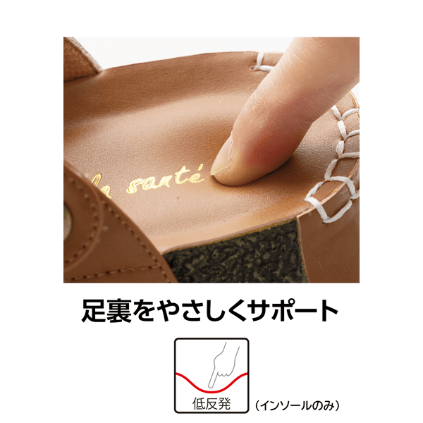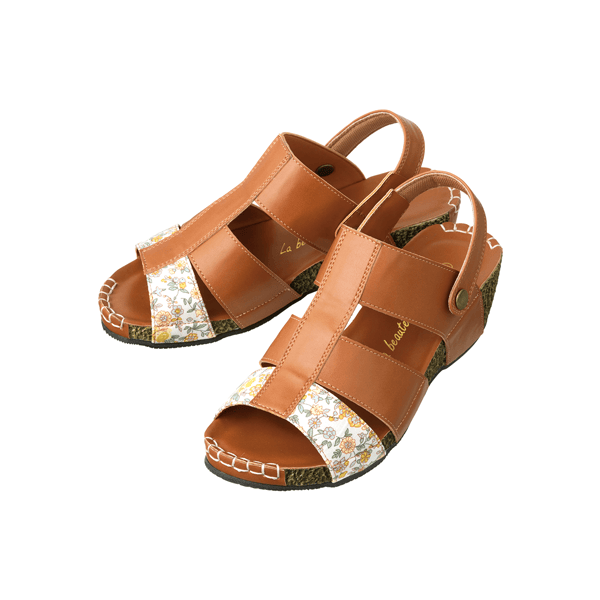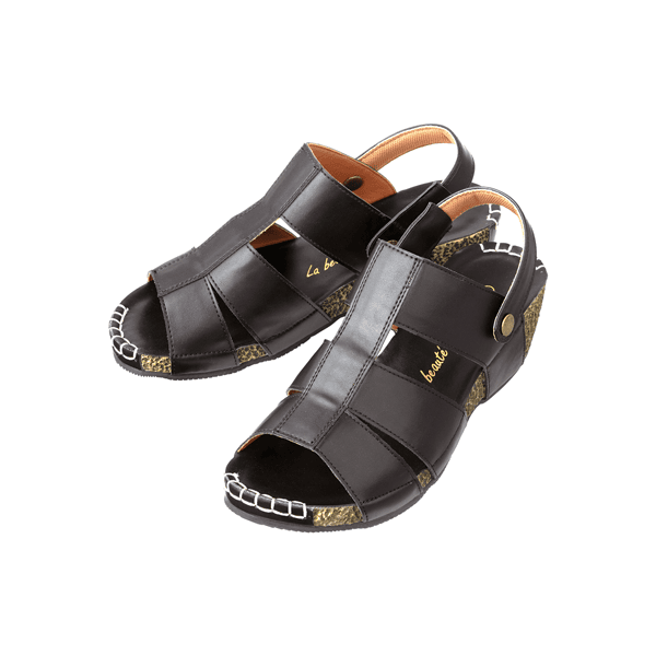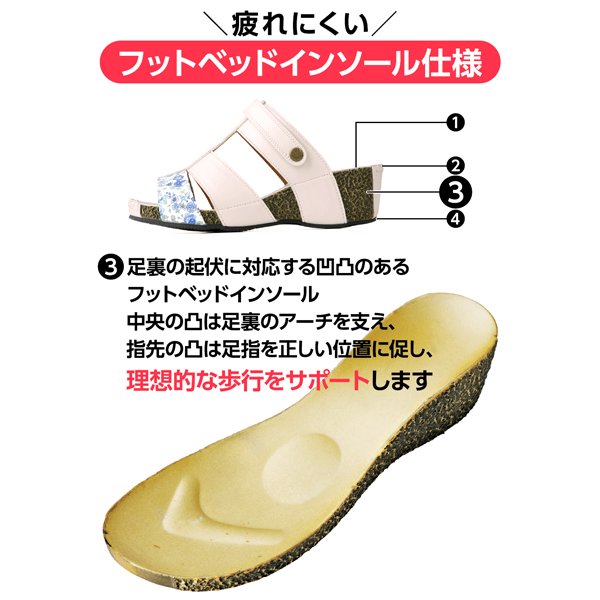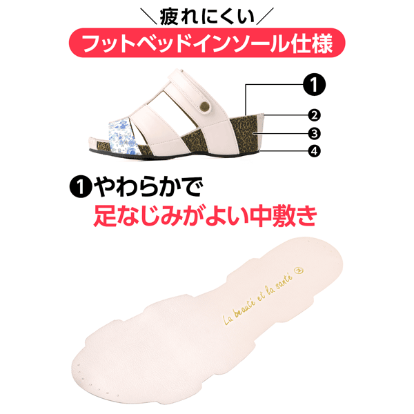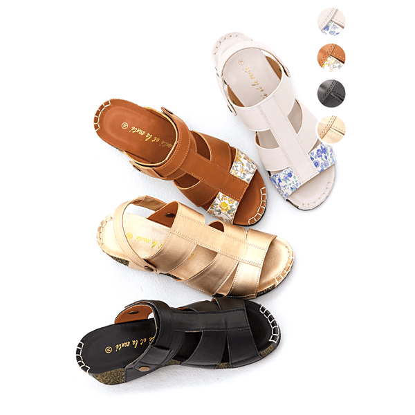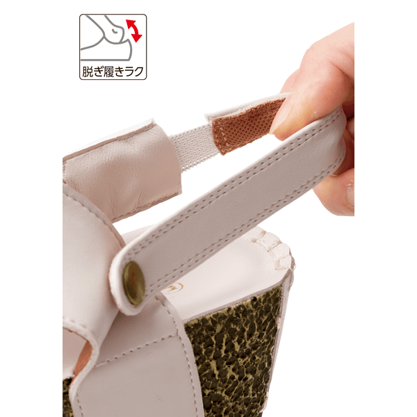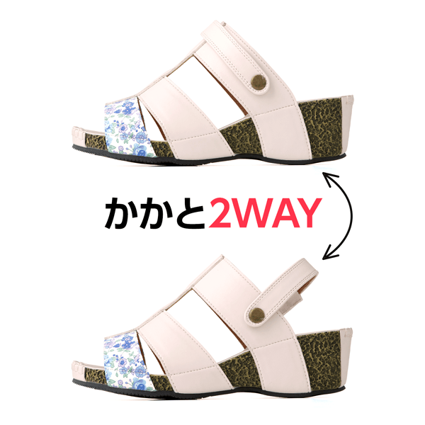 クッション性のあるフットベッドインソールが歩行時の衝撃を吸収する、疲れにくいサンダル。約5.5cmのウェッジソールで美脚見えします。ストラップの上げ下げで履き方が変えられる2WAYで、ハンドステッチをほどこした高級感のあるデザインです。