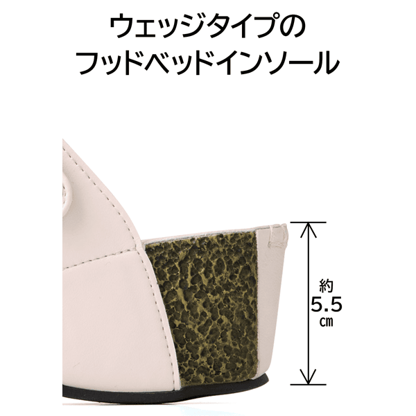 足長:23.0cm/ワイズ:E/試着サイズ:S/特徴:やや幅狭・甲薄- 足裏に沿うフットベッドインソールが快適で、踏み込んだ時のかかと側のクッション性が心地よいです。約5.5cmのウエッジヒールも安定感があります。