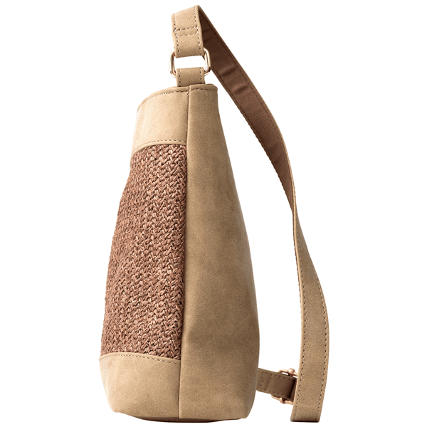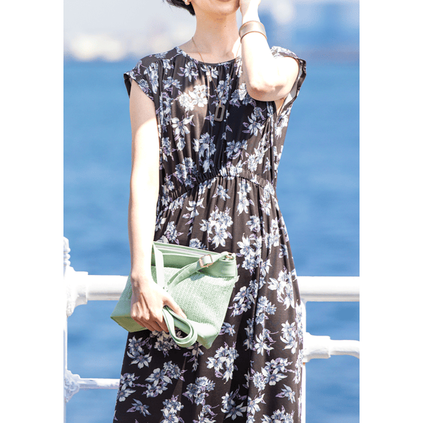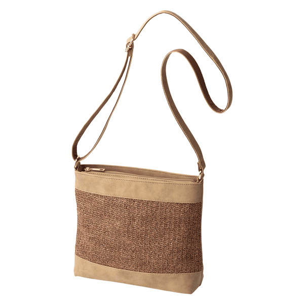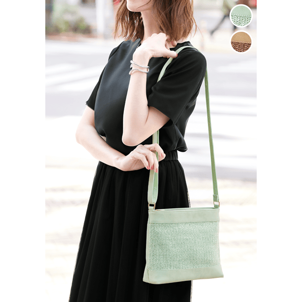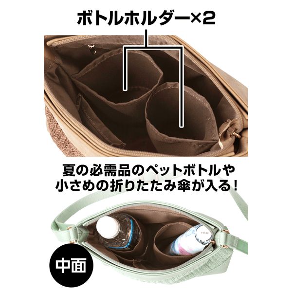 メッシュ素材が夏らしい軽やかショルダー。ペットボトル(500ml)や小さめの折りたたみ傘が入るボトルホルダー付きで、すっきり収納できます。