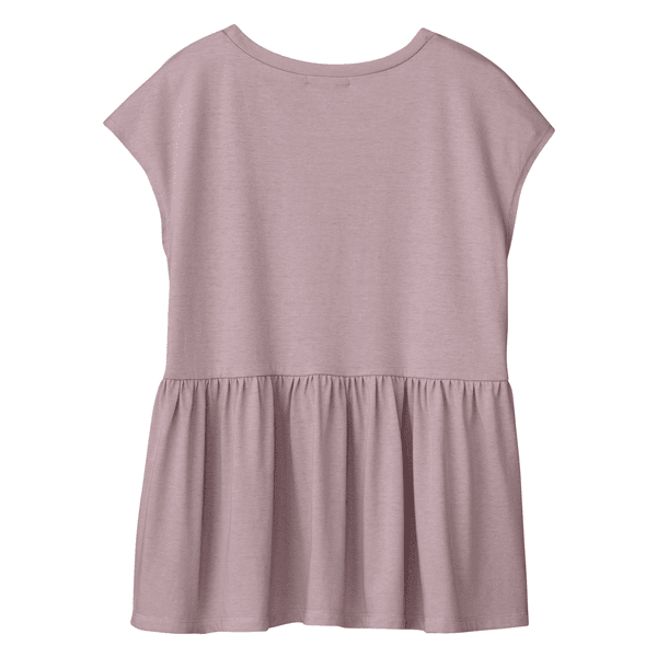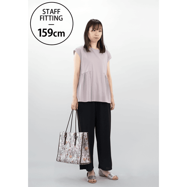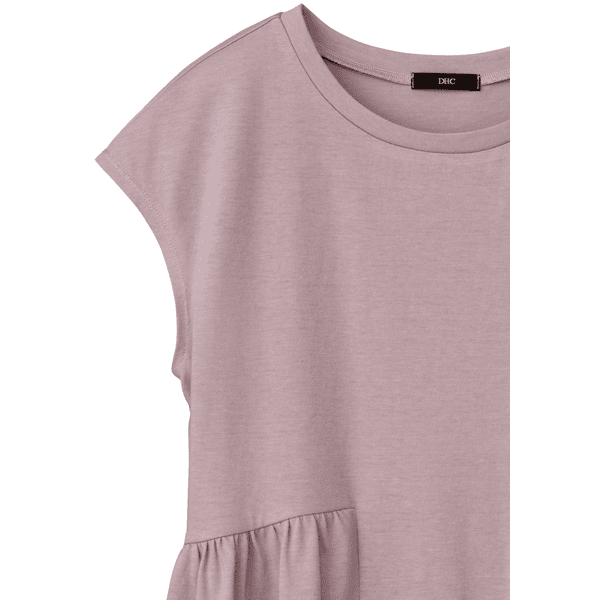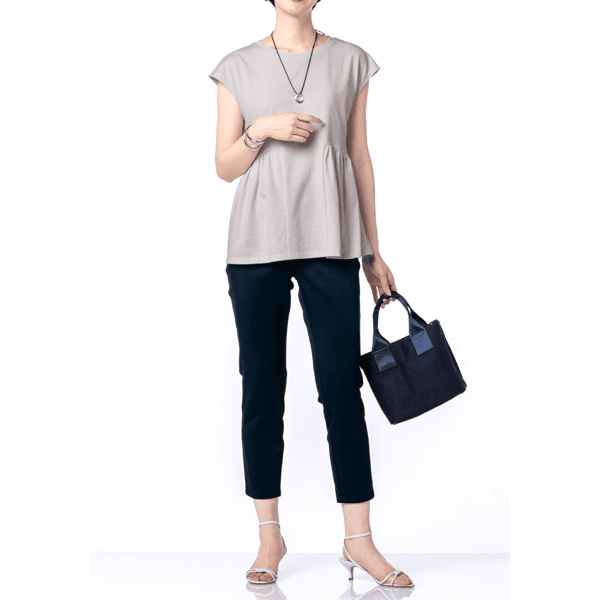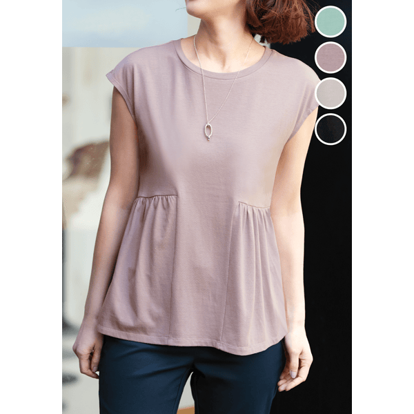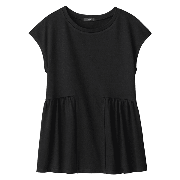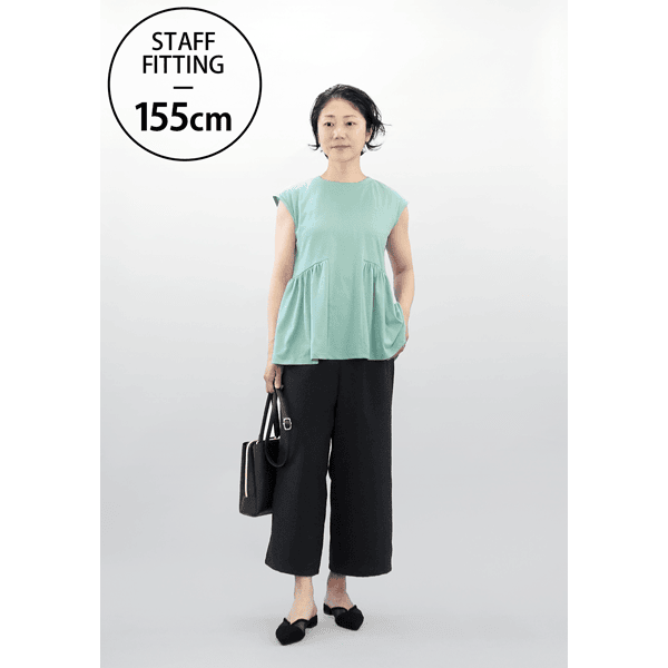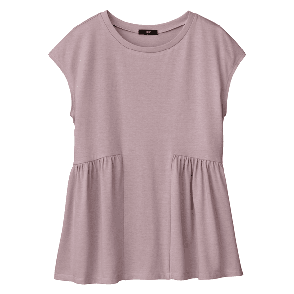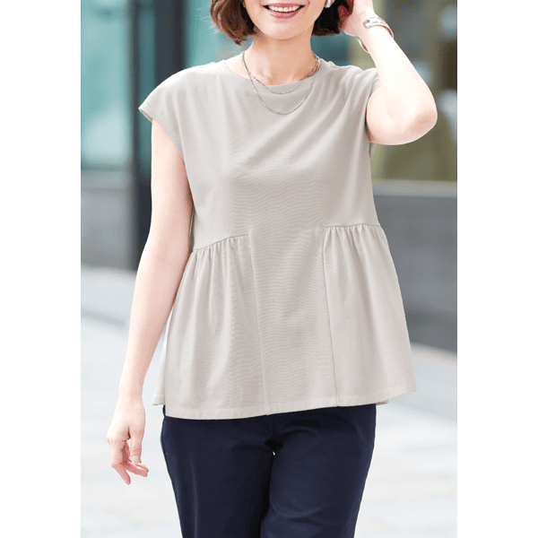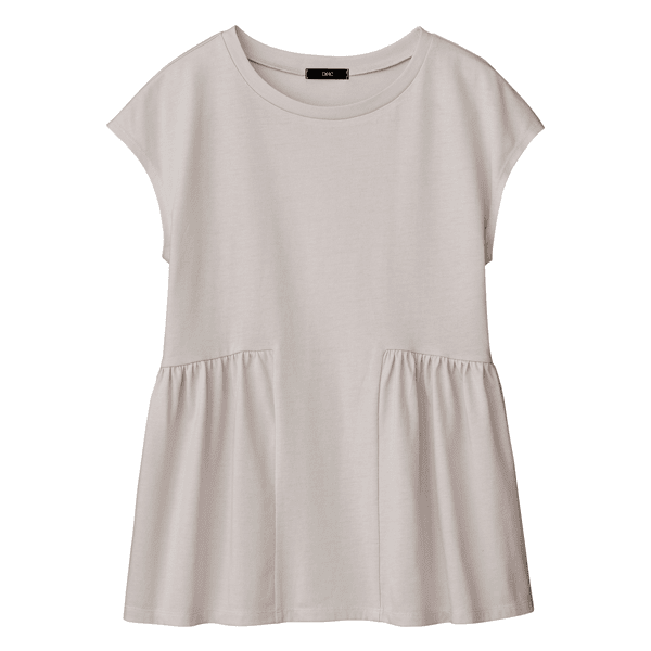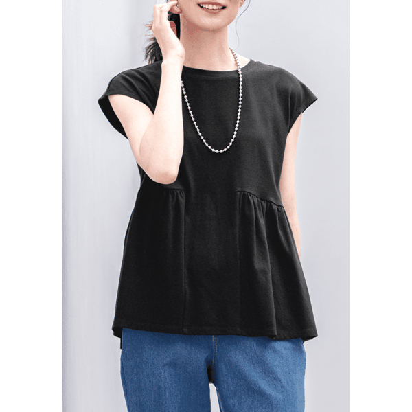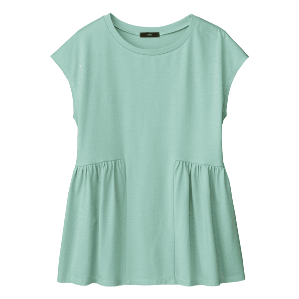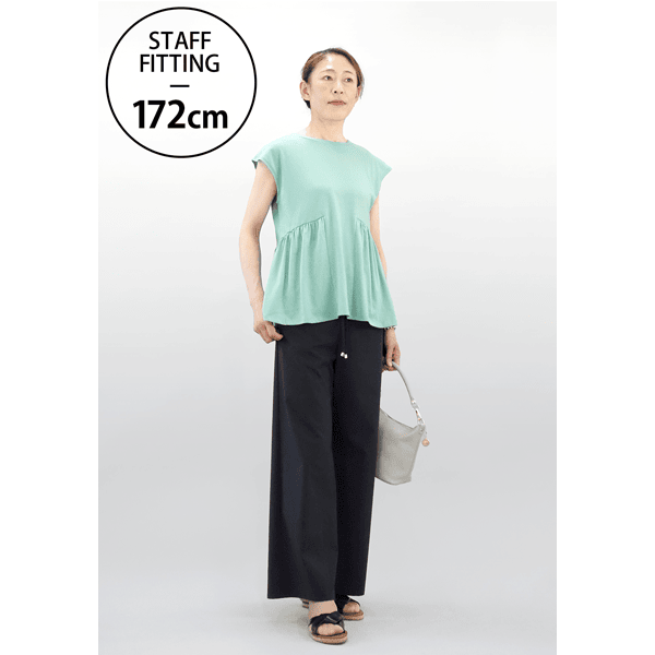たっぷりのギャザーでお腹まわりをカバーする着映えカットソー。斜めの切替えでウエスト位置を高見せします。