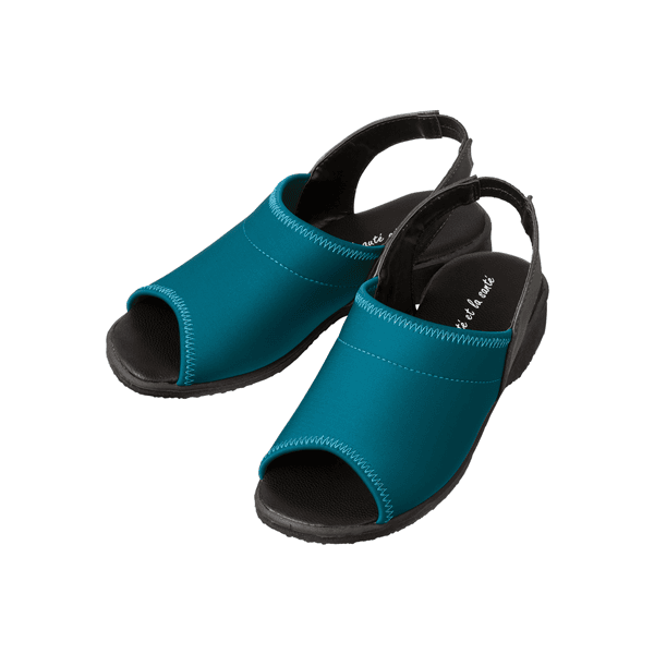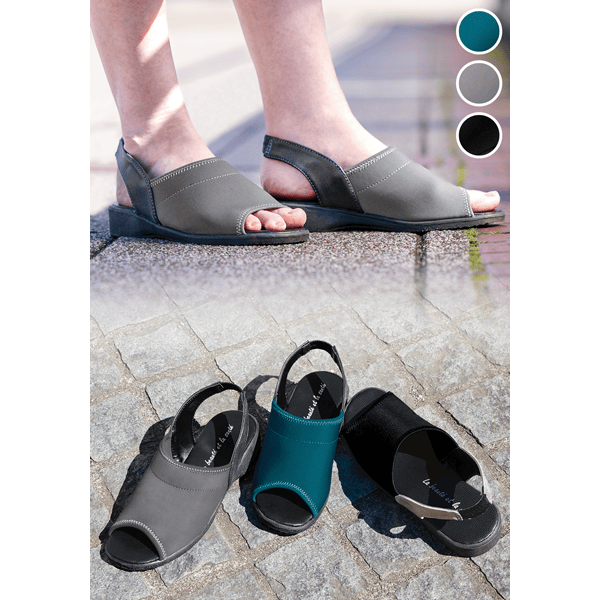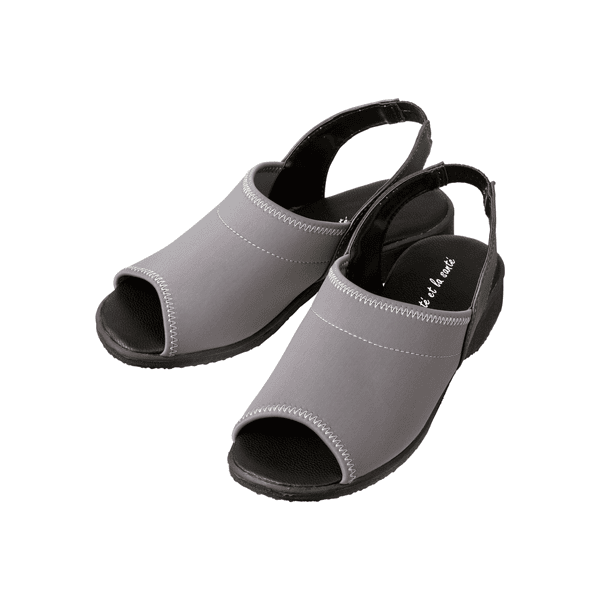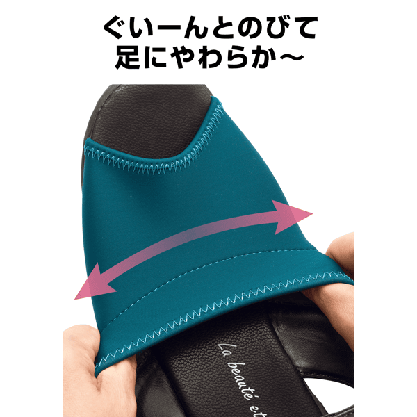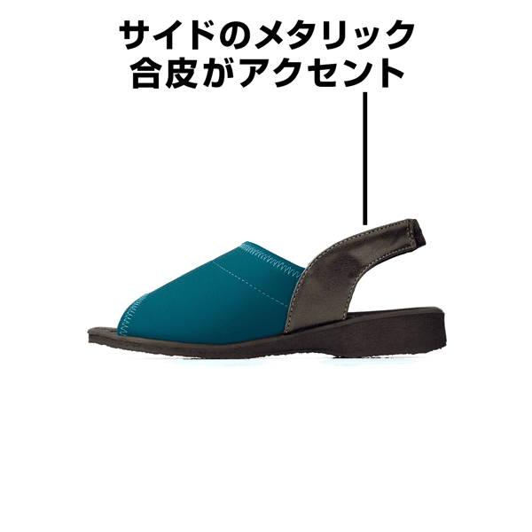 ストレッチ性があり、足の甲にやわらかく沿って履き心地がやさしいサンダル。ささっと履けて、ゴムがかかとをしっかりホールドします。サイドのメタリック合皮が大人っぽいアクセントに。