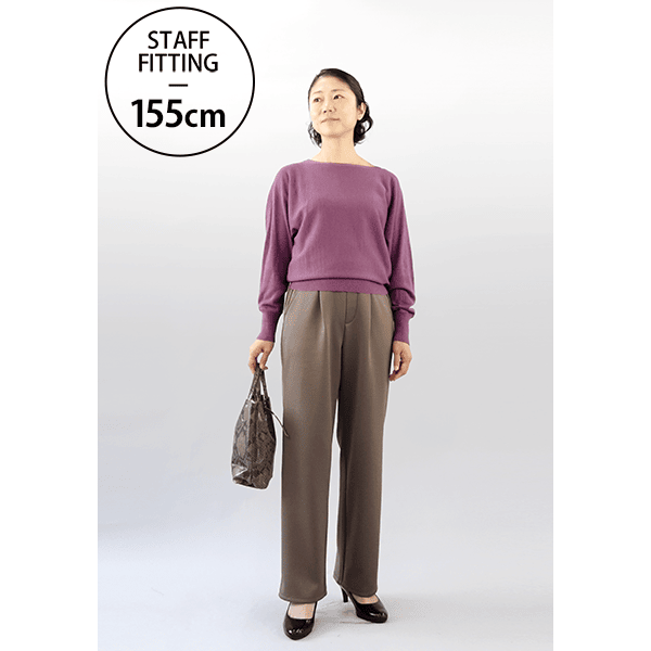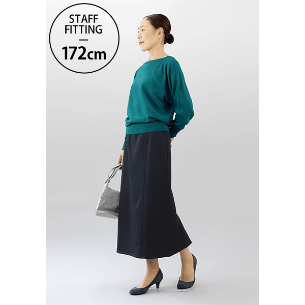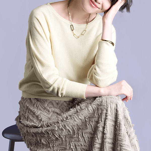 ドルマン袖で二の腕をカバーしながら腰まわりはキュッと絞った華奢見えニット。生地の落ち感で美しいドレープが生まれて単調に見えないから、キレイめからカジュアルまで幅広く着回せます。