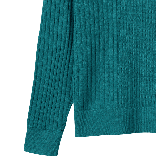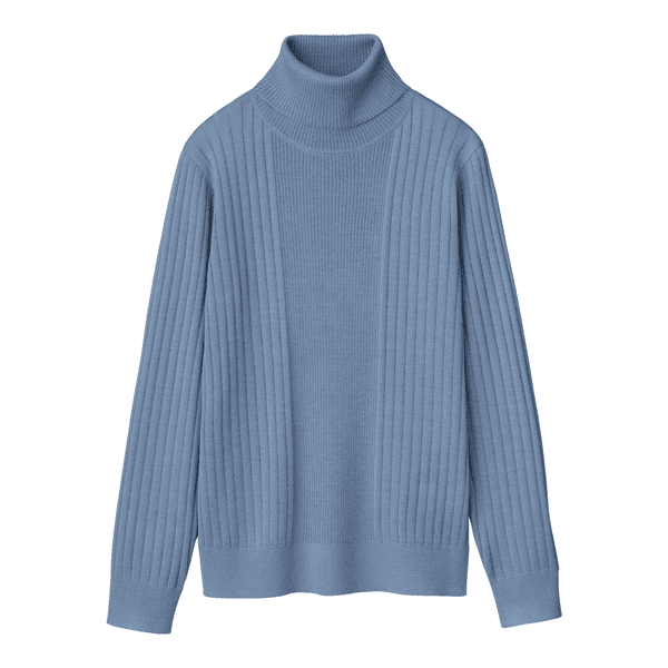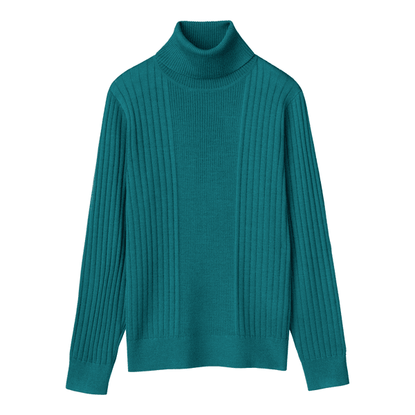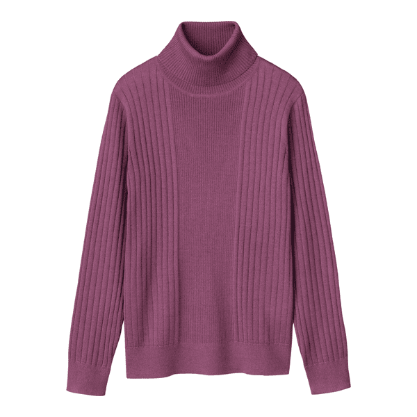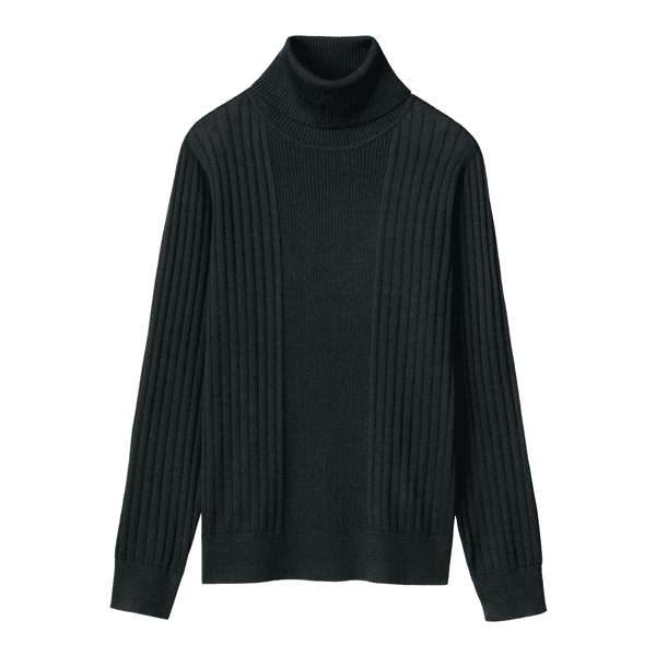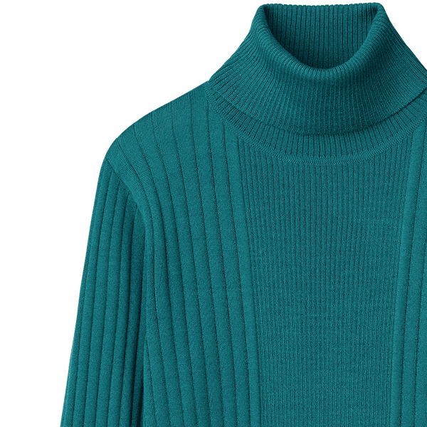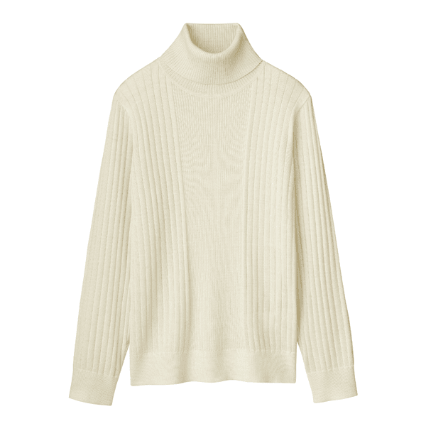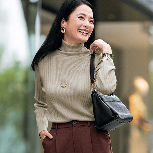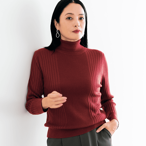 幅の違うリブ編みを視覚効果で細見えする位置で切替えたタートルネックのプルオーバー。ゆとりのあるサイズ感で身体のラインをひろわず、すっきり見えします。