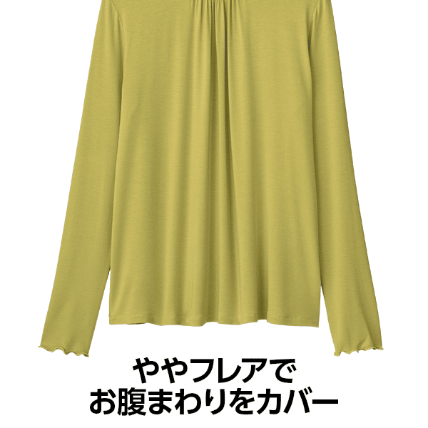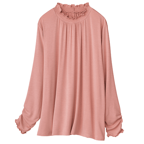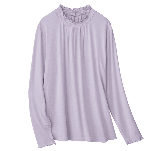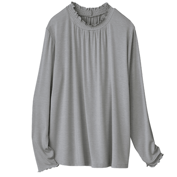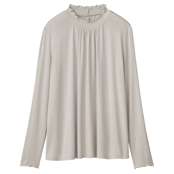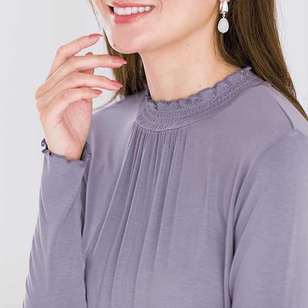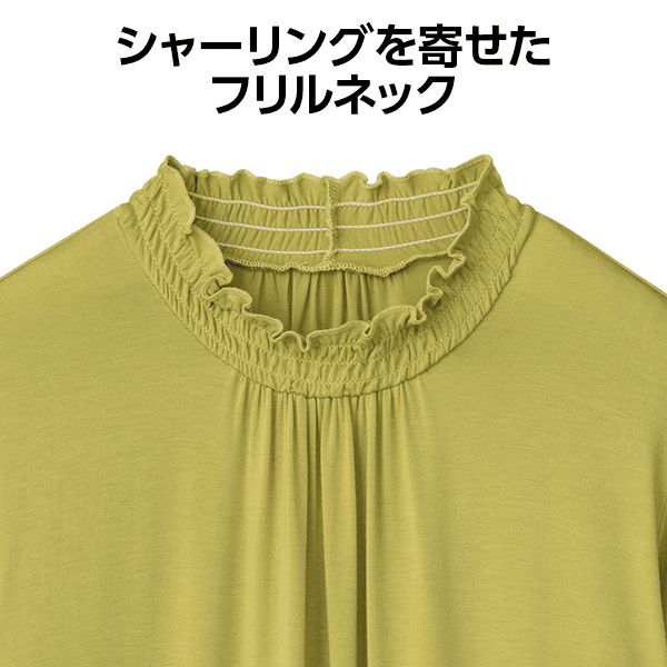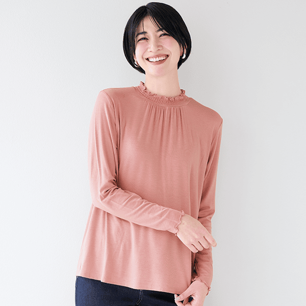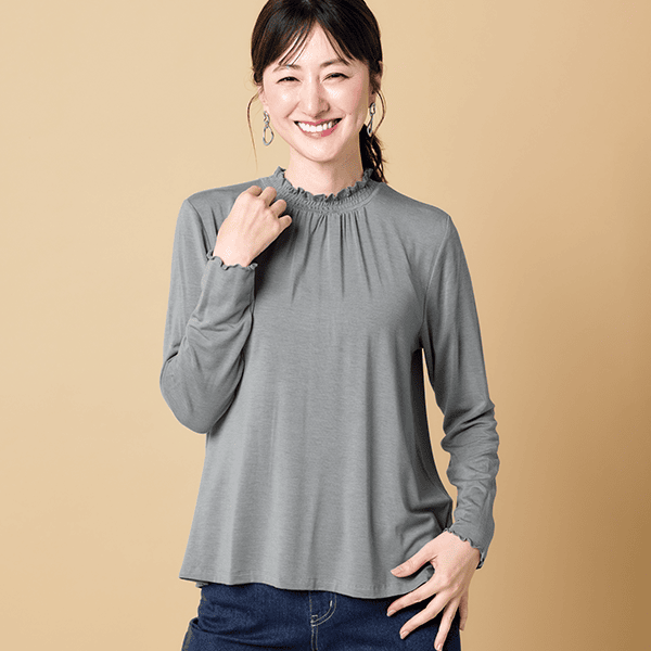 アルガンオイル配合で保湿機能のあるカットソー。アクセントになるシャーリングネックデザインで、首元をカバーしながら華やかな印象をつくります。 シンプルなので、重ね着もしやすいです。