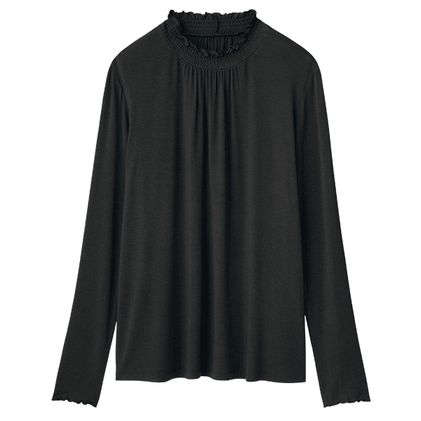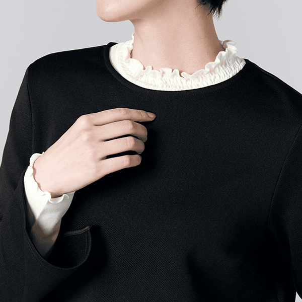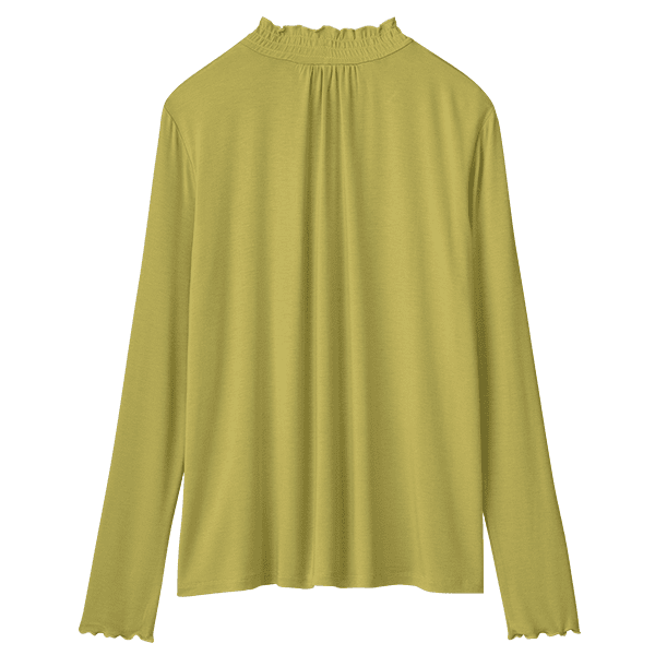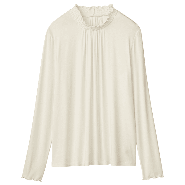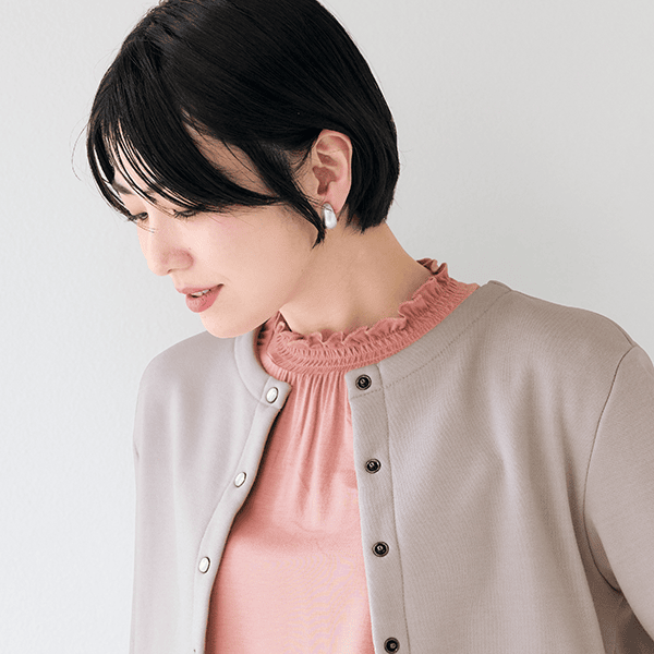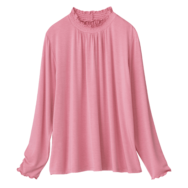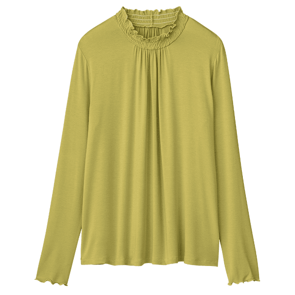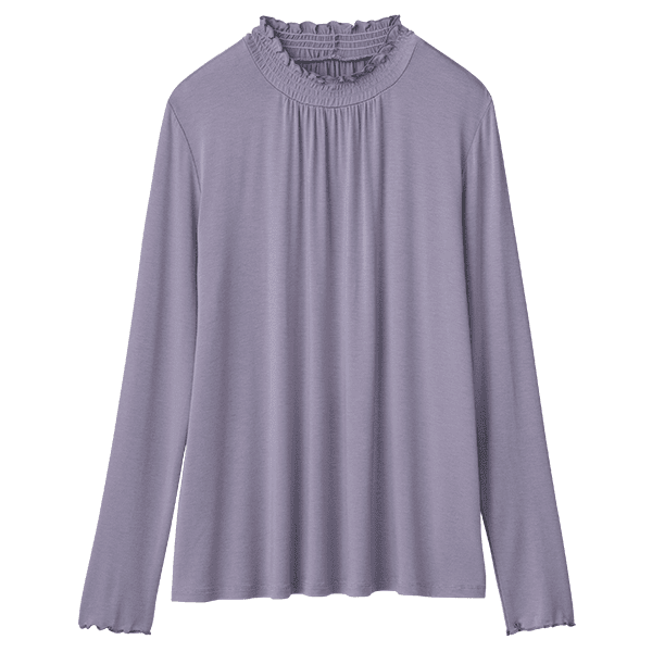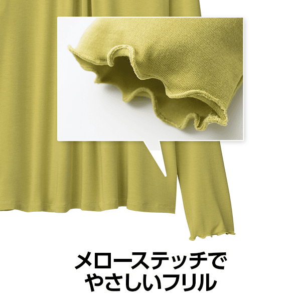 アルガンオイル配合で保湿機能のあるカットソー。アクセントになるシャーリングネックデザインで、首元をカバーしながら華やかな印象をつくります。 シンプルなので、重ね着もしやすいです。