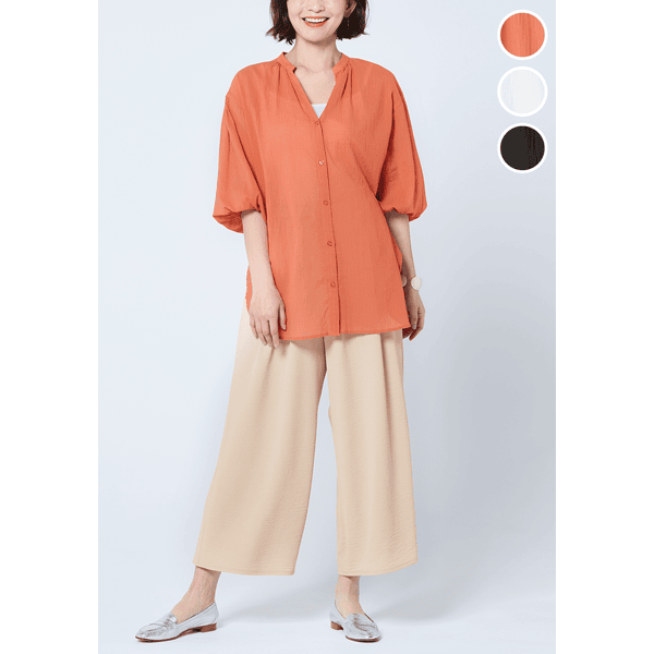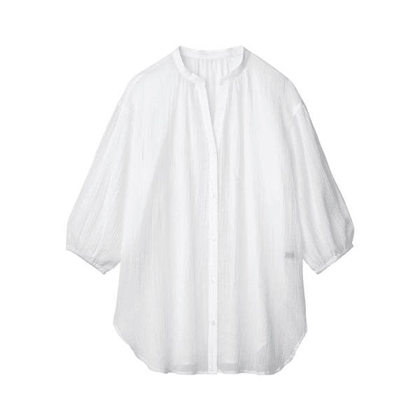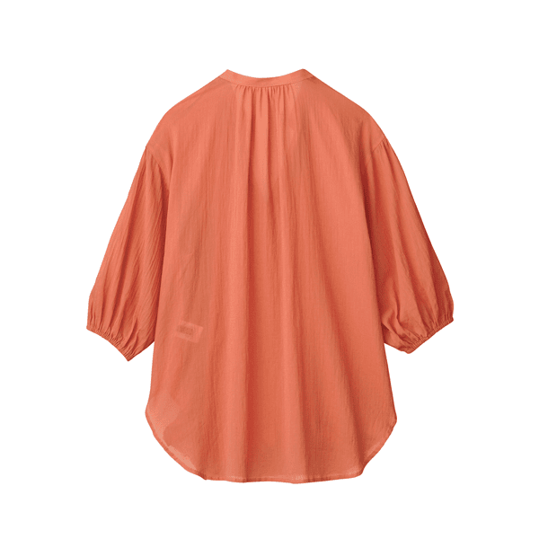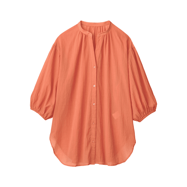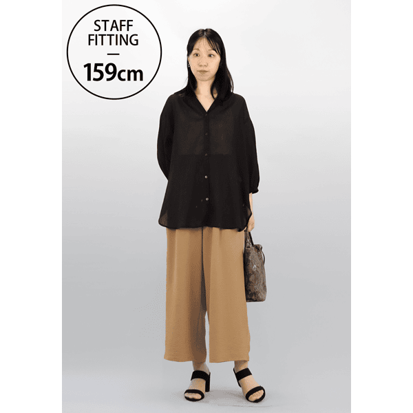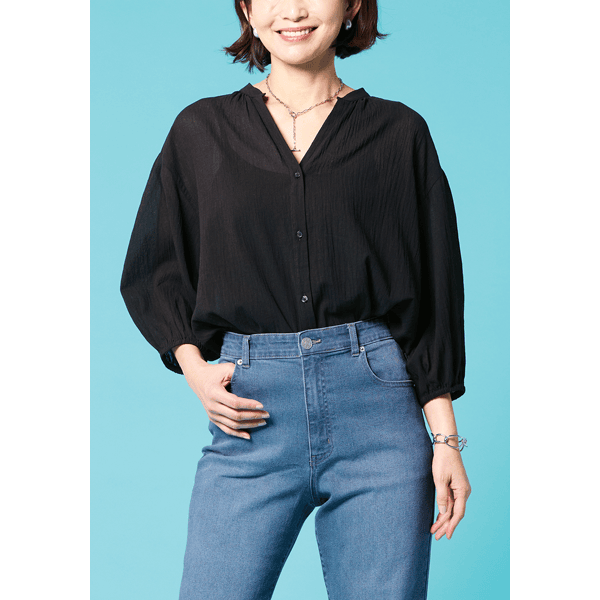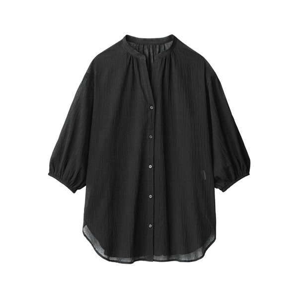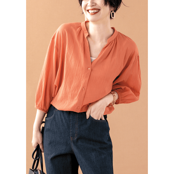 シボ感のある風合いが上品なこちらのシアーシャツ。ふんわりした8分袖は袖口がゴム仕様で、たくし上げると半袖風に着ることも可能です。ボタンを留めてブラウス風に着たり、前あけで羽織りにしたりと幅広い着こなしが楽しめるので、夏から秋へ移行するスイッチ服として重宝します。