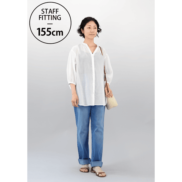 綿100%のサラサラした薄手の透け感ある素材です。7号でボタンを全部外さなくてもかぶれるくらいのゆとり感です。袖口がゴムギャザーなので袖を短くたくし上げてボリューム袖の様に着ても素敵でした。楊柳がとても爽やかな印象のシャツです。