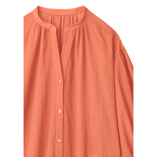 綿100%の肌あたりが良いソフトで軽い生地です。空気をまとうような感じで、涼し気です。釦をせずに羽織りでも、釦をして少しきちんと感を出しても、色違いで揃えても良さそうです。ギャザーとゆとりがあるので、ワンサイズ下でも問題ないサイズ感です。