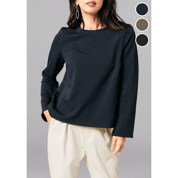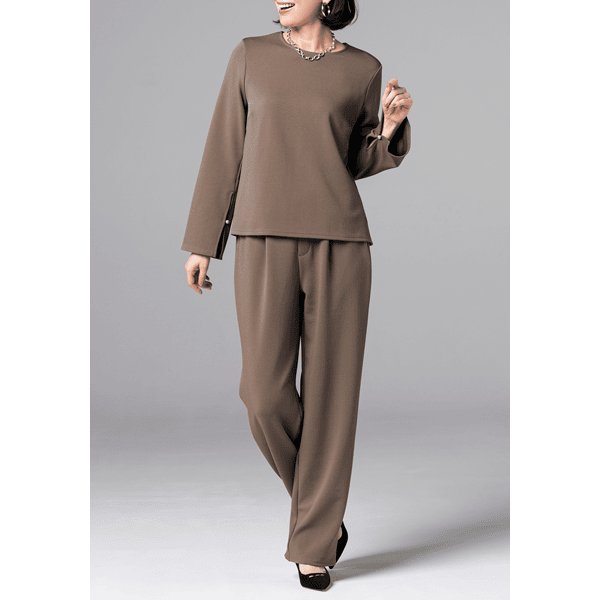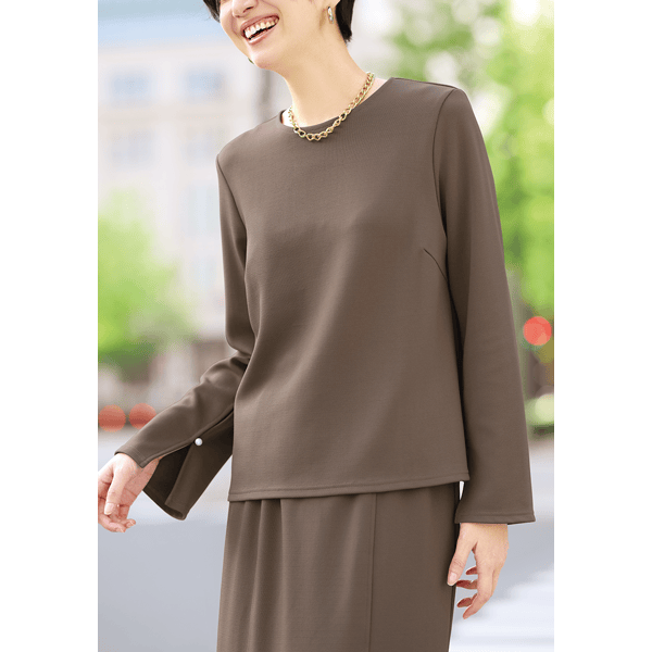 きれい見えして着心地もお手入れもラク!裏起毛と保温機能であったかなスマートジャージーシリーズ。オンオフを選ばず、単品でもセットアップでも着られる着回し力の高いプルオーバーです。
