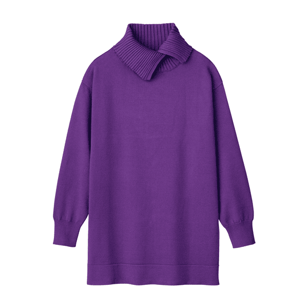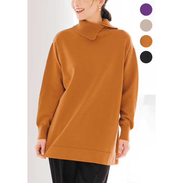 スリット入りのタートルネックがポイントのニットチュニック。ゆったりシルエットとヒップが自然に隠れる丈感でボディラインをカバーします。ベーシックカラーとアクセントになる差し色がそろう4色展開です。