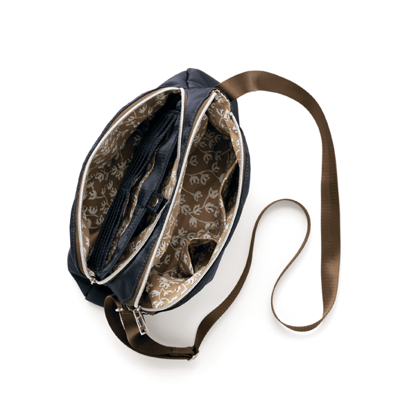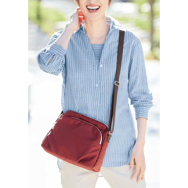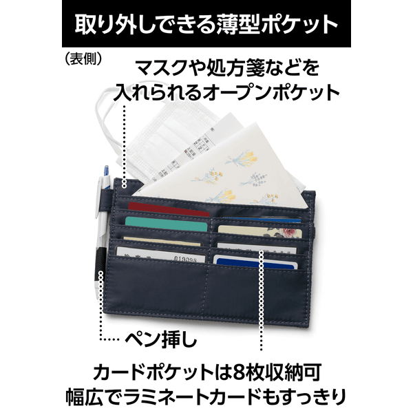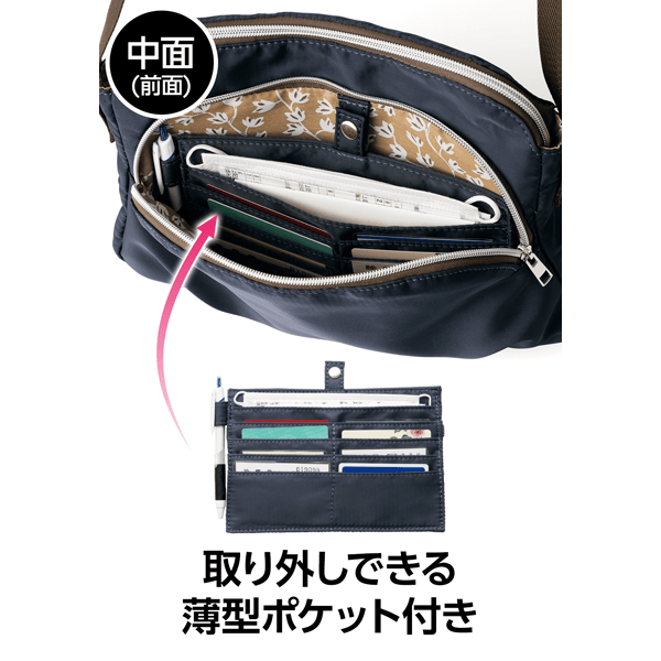 取り外し可能な薄型ポケット付きの通院に便利な多機能ショルダーバッグ。薄型ポケットには診察券やお薬など通院時に必要なものをひとまとめに収納可能。シンプルだからデイリーにも使えます。
