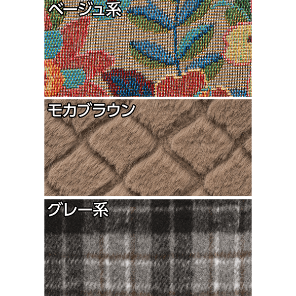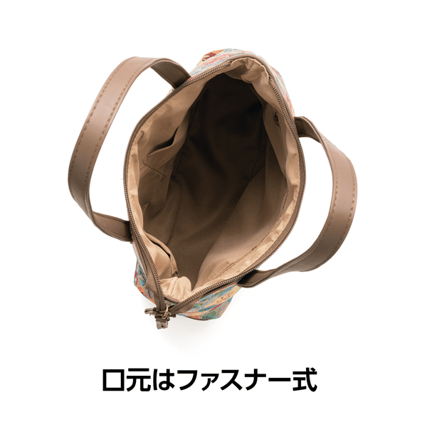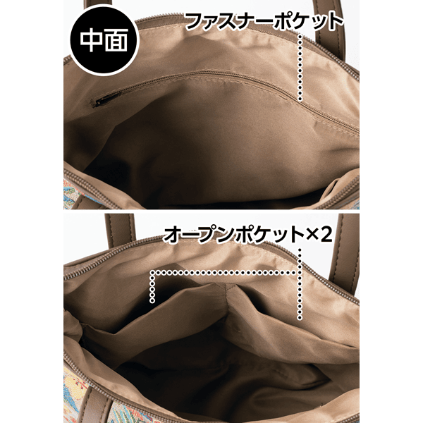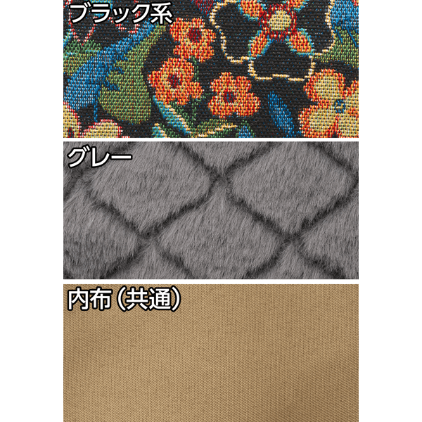 - 素材/表地:ベージュ系・グレー系・ブラック系:ポリエステル・綿・その他 モカブラウン・グレー:ポリエステル 内布:ポリエステル 持ち手・底面・ファスナー引手・口元パイピング:合成皮革