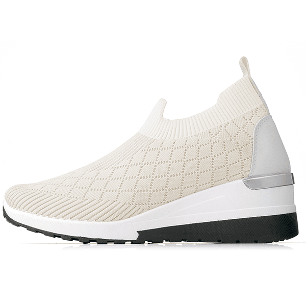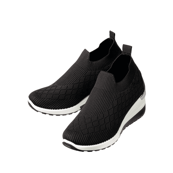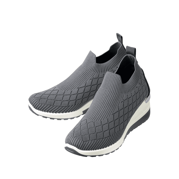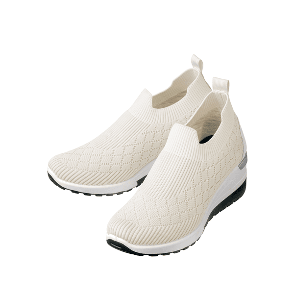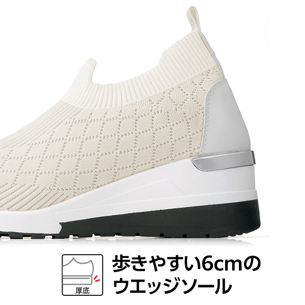 足長:23.5cm/ワイズ:EE/試着サイズ:M/特徴:やや幅広・甲高- ニット素材なので甲周りはソフトにフィットしながら、自分の足幅に馴染んで広がり、当たり等のストレスがありません。かかとのリブがやや高めの位置まである為、安定感もあります。6cmのウエッジソールで楽ちんに足長効果も狙えます。
