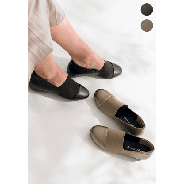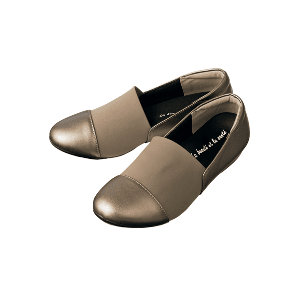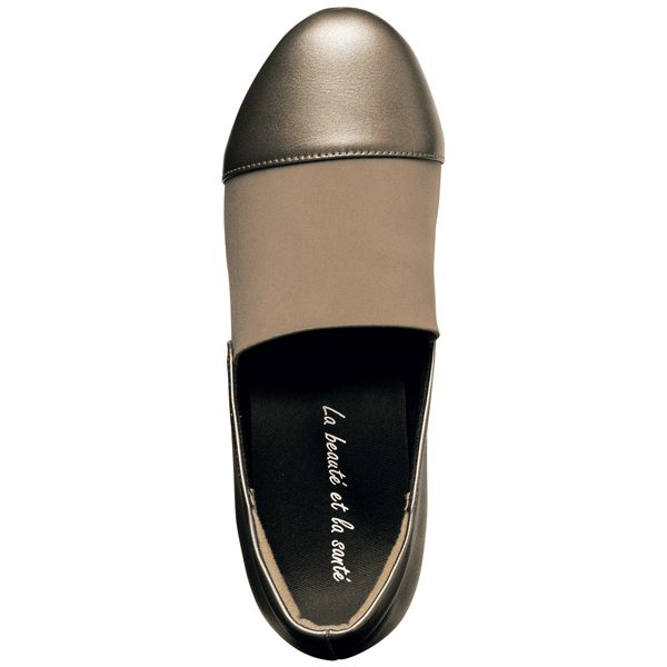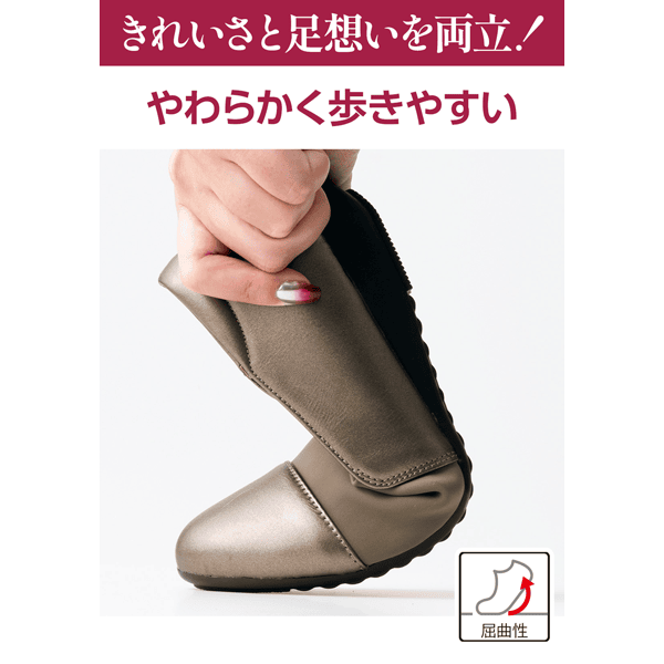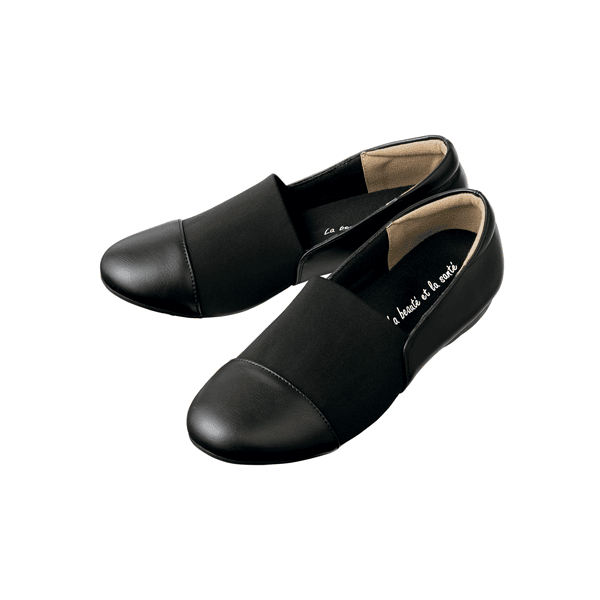 合皮とストレッチ生地を組み合わせたデザインで足を締めつけにくく、外反母趾の方も痛くなりにくいオンオフ両方使えるキレイ見えパンプス。歩きやすく足裏も心地よい仕様で、我慢せずに素敵さも欲しい、大人のお助け靴です。