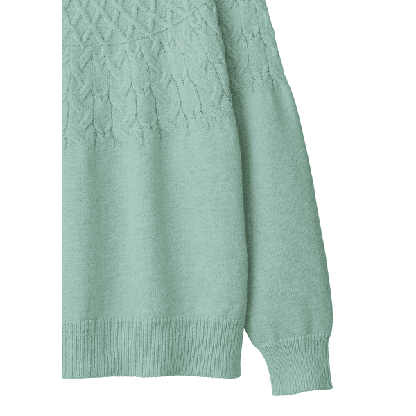 2種類の柄を組み合わせた高級感あふれる求心編みで、一枚でサマになるふっくらとしてやわらかなミドルゲージニットです。