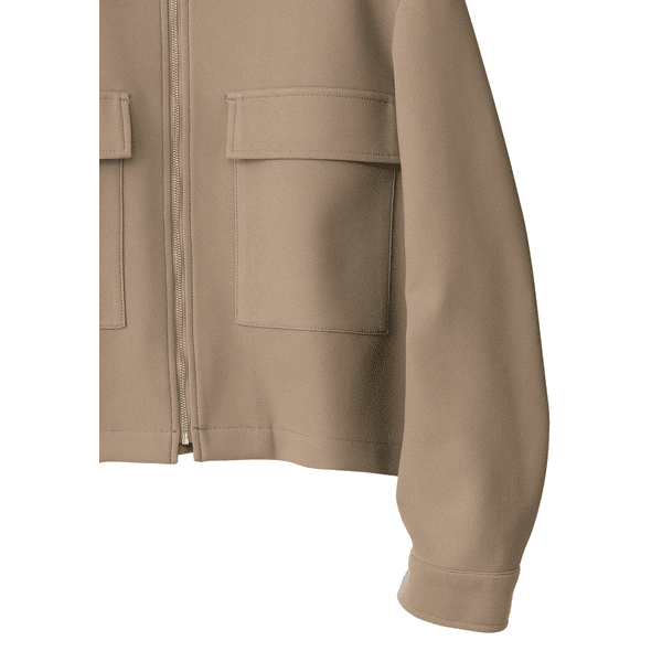 肌触りの良いなめらかな素材が裏側にボンディングされている、ふくらみを感じる素材です。伸びる上に、ゆとりも十分あるのでSで良いです。丈が短めなので背の小さい私でもバランスよく着られました。袖口を折り返して着るとより春らしくなる、そんなアウターでした。