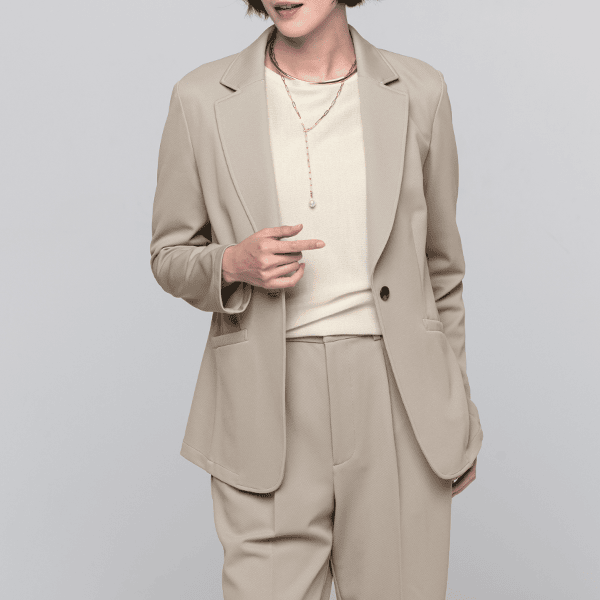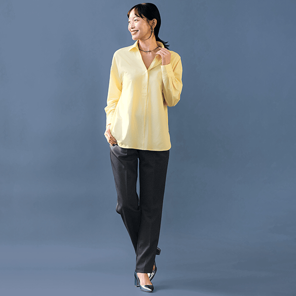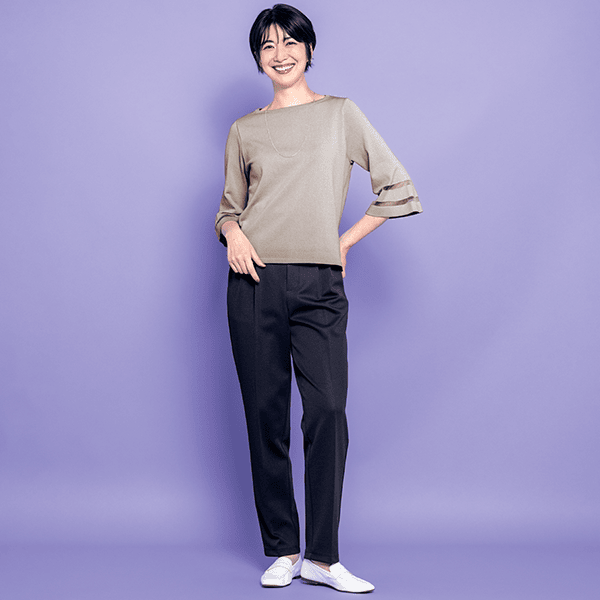 縦横ストレッチ性があり、裏地はありませんが、しっかりとした生地なので、透けは気になりません。腰回りにゆとりがあるデザインなので、スッキリめがお好みな方は、ワンサイズ下を選んでも良さそうです。骨太のがっしり体型でもMで大丈夫でした。同素材の「洗濯機で洗えるユースフル」シリーズで組み合わせれば、いろいろな着こなしが楽しめそうです。