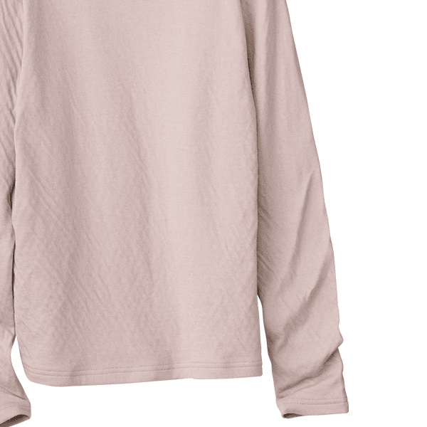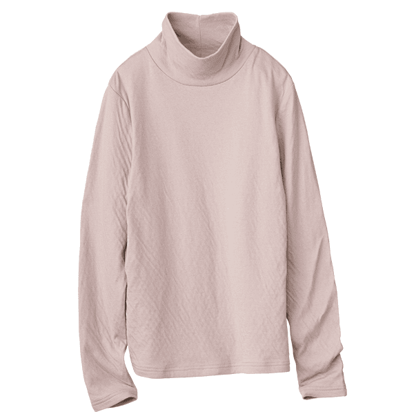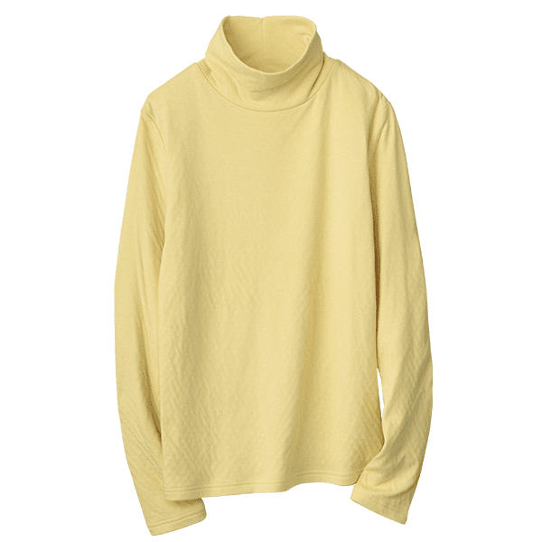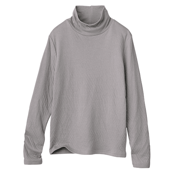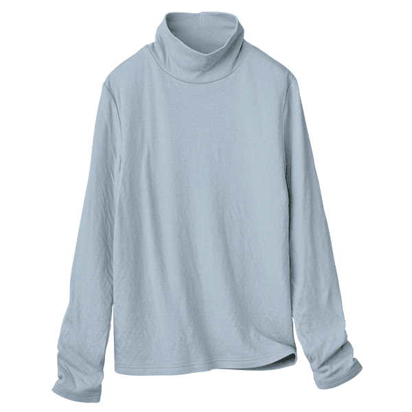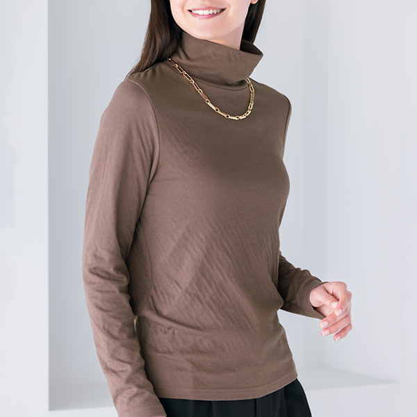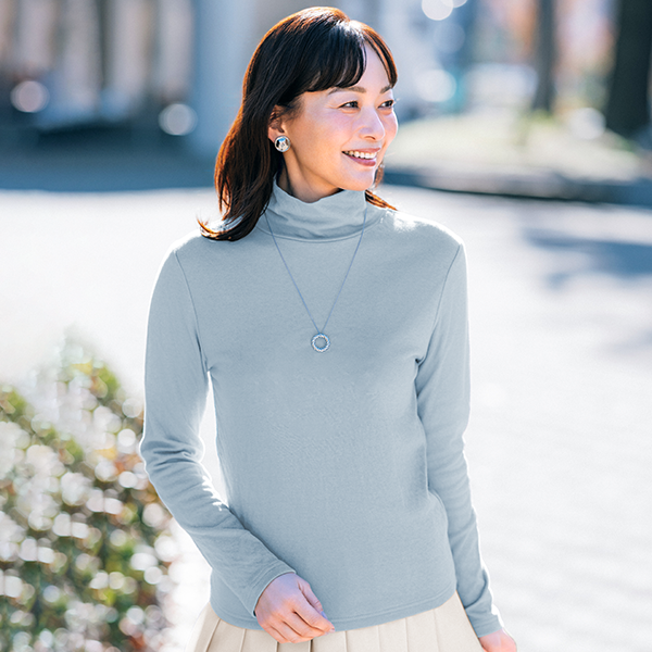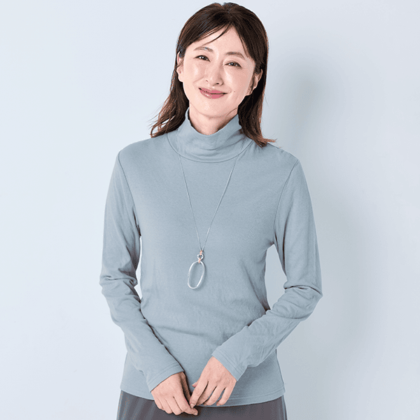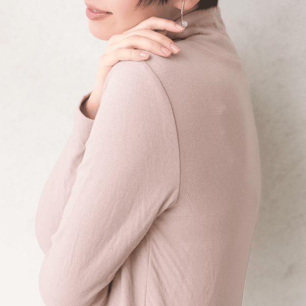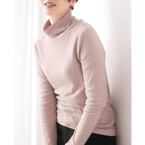 年々、肌が敏感になってきていると実感しませんか?ちょっとした繊維の刺激にストレスを感じることも…。そんな大人の女性の肌にそっと寄り添ってくれるのが綿100%のダブルガーゼなんです。コットンの糸をやわらかく編み立て、2重に仕上げた生地はとてもやわらかく、もちもちっとして赤ちゃんを包みたくなるほどやさしく、敏感な肌を包み込みます。ほどよい高さとゆとりのハイネックで首元をカバーできるのもうれしいポイントです。