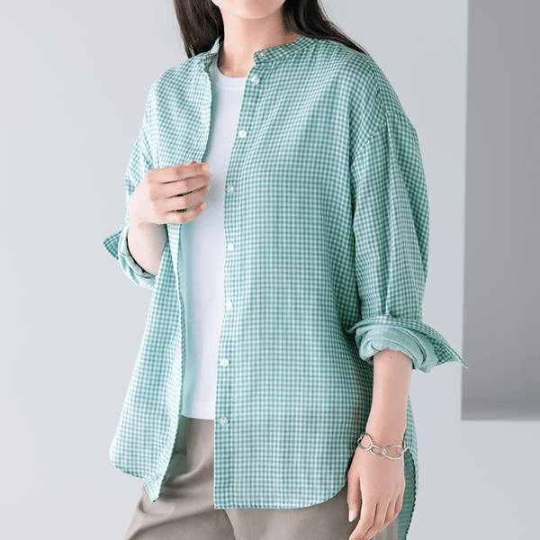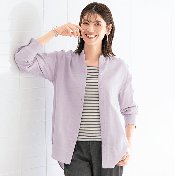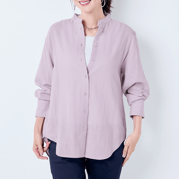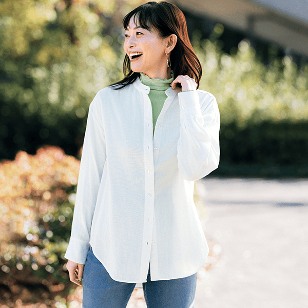 やさしい着心地で大人の肌に寄り添う綿100%のバンドカラーシャツ