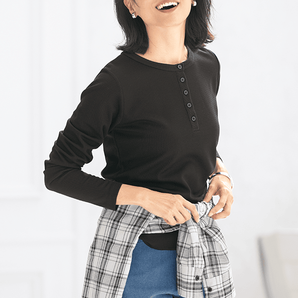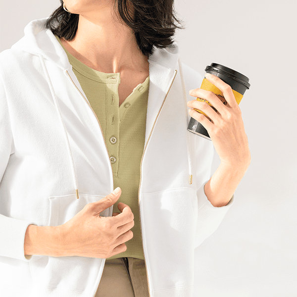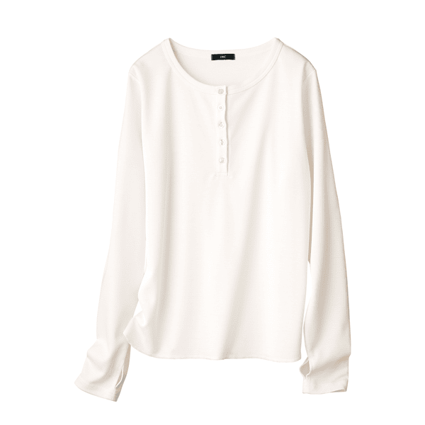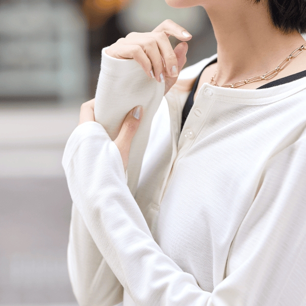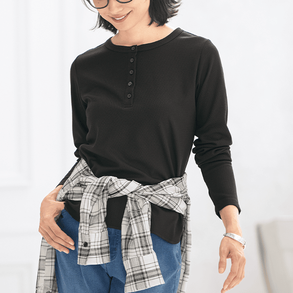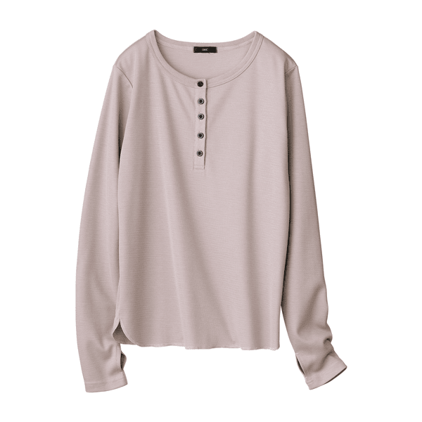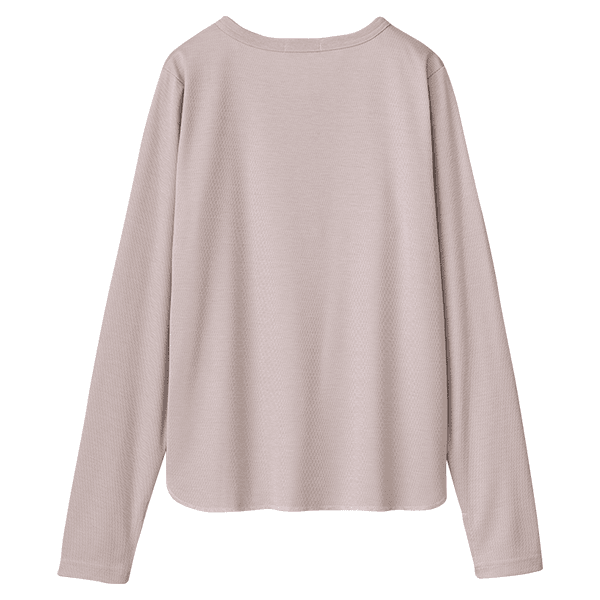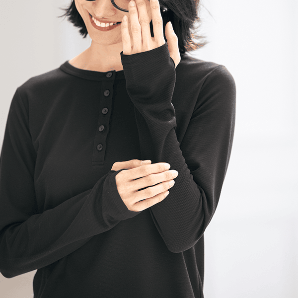 1枚でも着られて、重ね着がしやすいゆとりもある、やさしい着心地のトップスです。指穴付きで手の甲をカバーできるのも乾燥しやすいのでうれしいです。