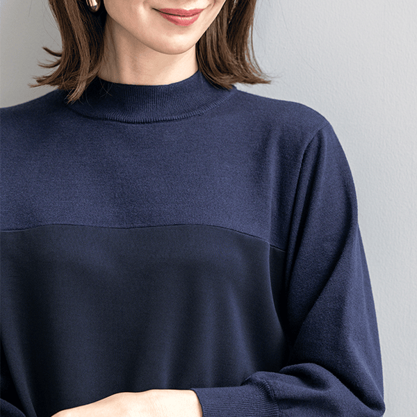 ニットとカットソーを組み合わせ、同系色でシックにまとめた大人なワンピース。ほどよいボリューム感があるので動くたびドレープが華やかにひるがえります。バストより少し上で素材を切替え、スタイルアップ効果も。