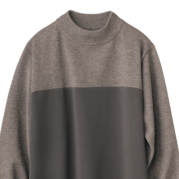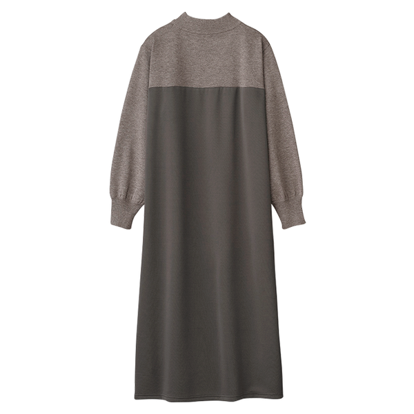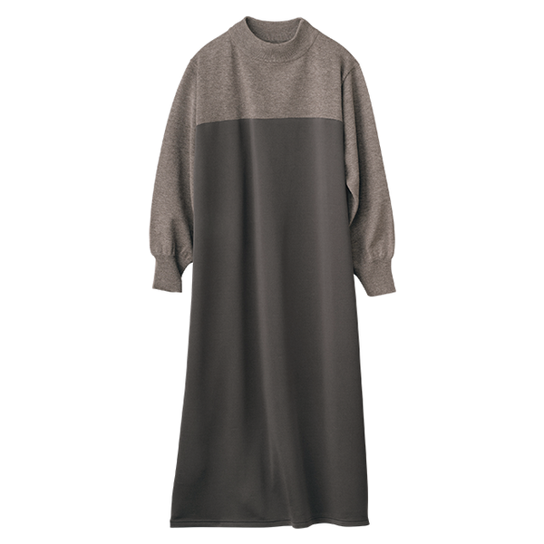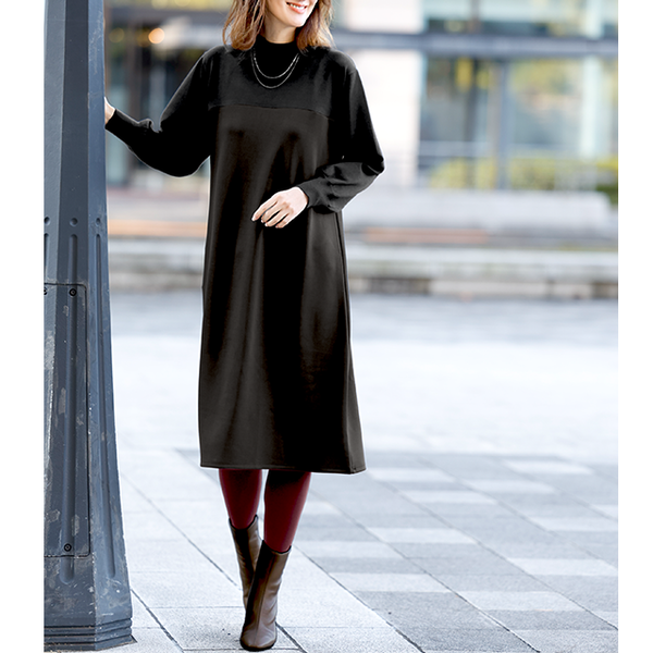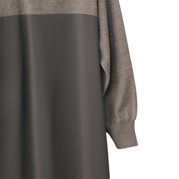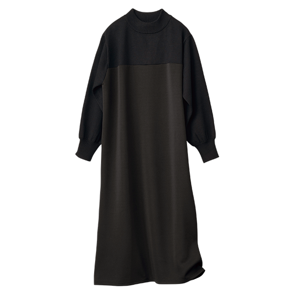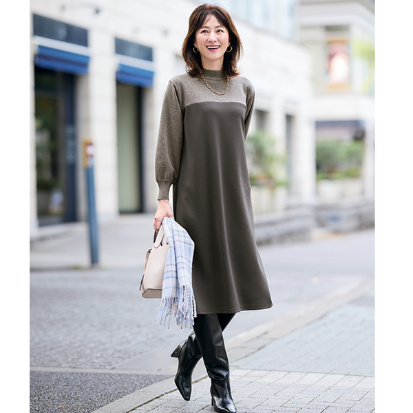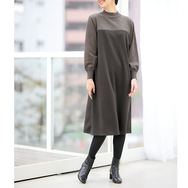 ニットとカットソーを組み合わせ、同系色でシックにまとめた大人なワンピース。ほどよいボリューム感があるので動くたびドレープが華やかにひるがえります。バストより少し上で素材を切替え、スタイルアップ効果も。