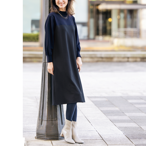 着るだけで即キマる♪ニットとカットソーを組み合わせた時短ワンピース