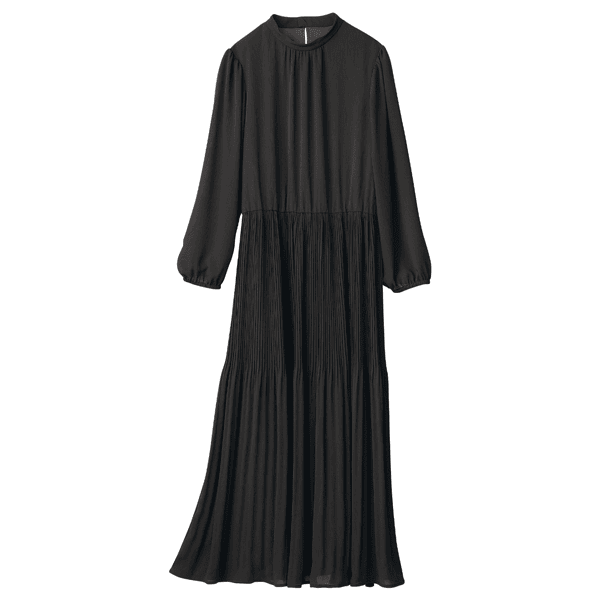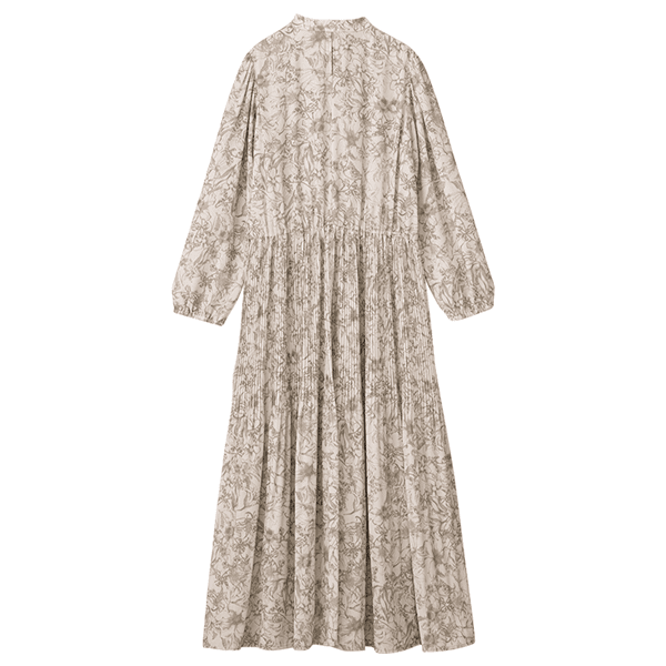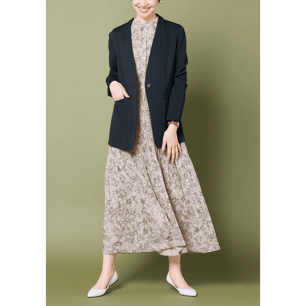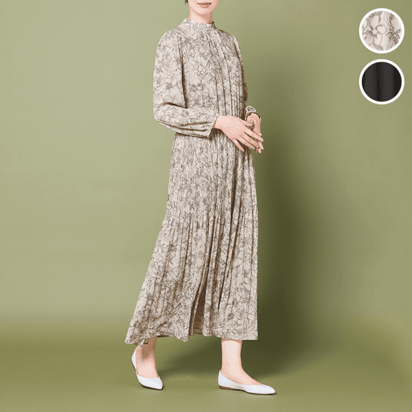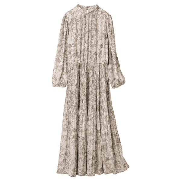 オンオフ着回せるワンピース。ウエストはフィットしすぎないゴム仕様で自然なくびれをつくり、細かなプリーツは落ち感があるので腰まわりをすっきり見せます。
