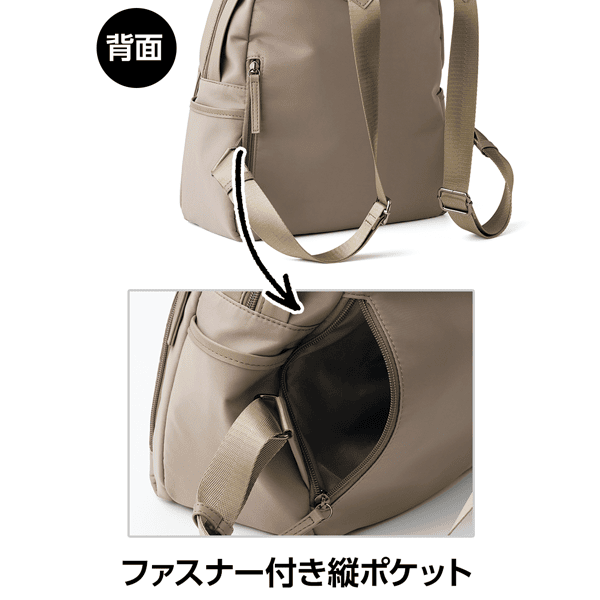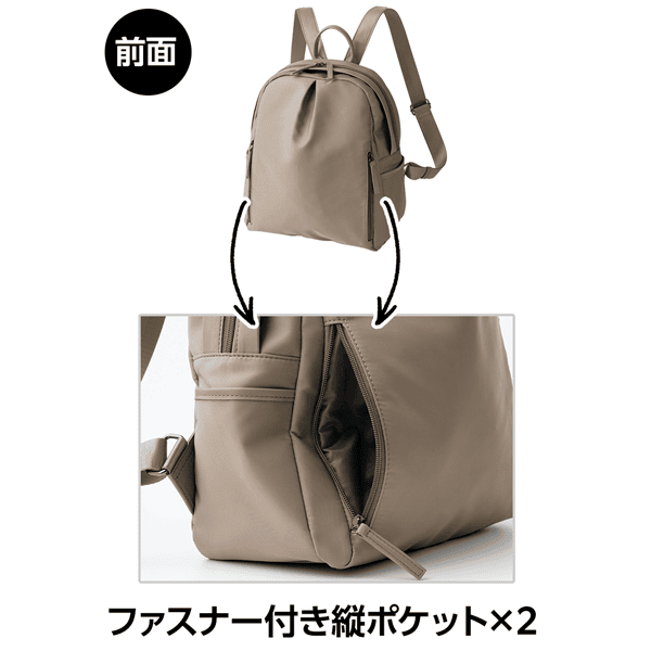 - 素材/表地:ポリエステル・合成皮革 裏地:ポリエステル 持ち手・口元・ポケット口・ファスナー引手:合成皮革 肩ショルダー:ポリエステル・合成皮革