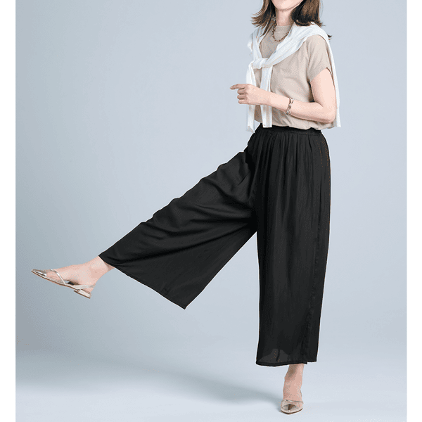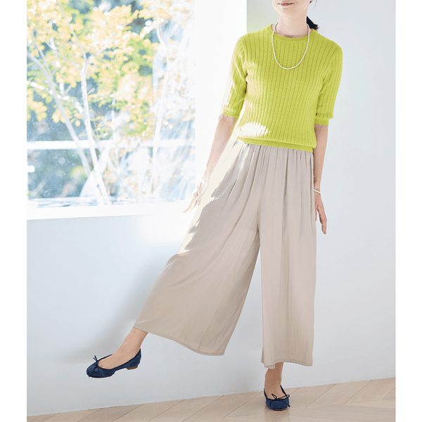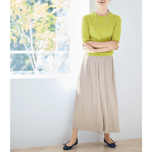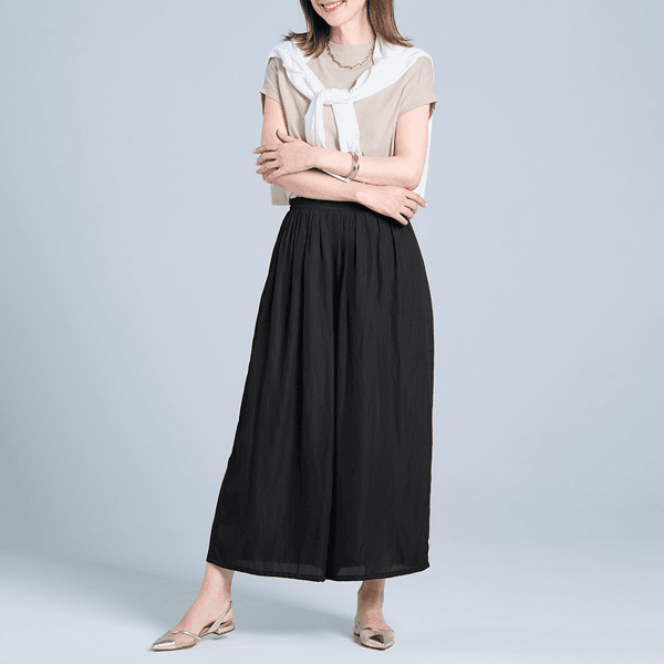 約195g(9号サイズ)と軽やかで、ストレスフリーな着心地のスカート見えギャザーパンツ。たっぷり入れたギャザーで下半身をカバーしスタイルアップ見えもかないます。