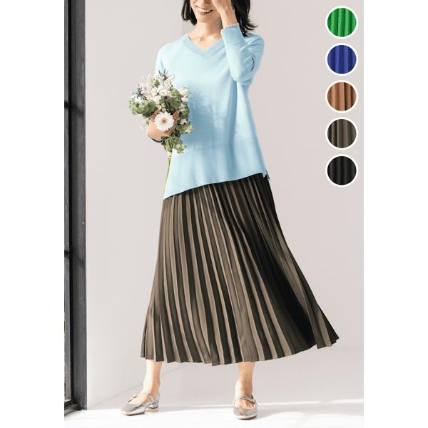 シルキーな光沢感がエレガントなオールシーズン着られるプリーツスカート。落ち感のある生地とロング丈がきれいなIラインをつくり、スタイルアップして見せます。発色のよい二重織り素材にプリーツ加工をほどこし、ほどよい厚みで透け感はありません。