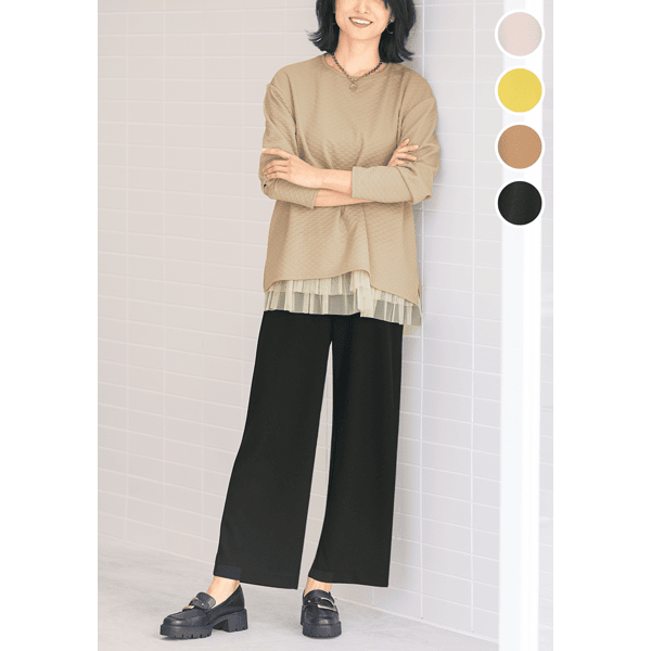ソフトな生地感ですっきりはけるきれい見えワイドパンツ。着用ジワになりにくく、お手入れもかんたんで普段使いに最適です。伸縮性のある軽くてソフトなカットジョーゼット素材で、春夏シーズン通して着られます。