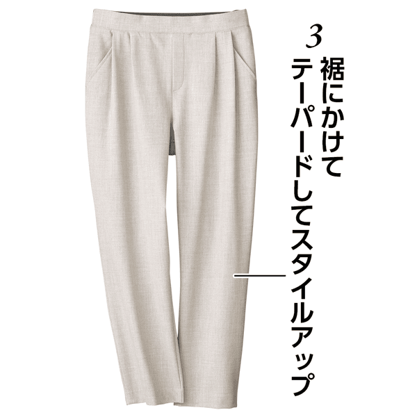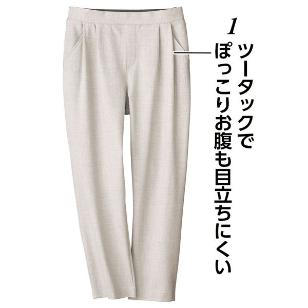 ウールの産地「尾州」の生地を使用した、高品質の日本製パンツ。ツータックデザインでお腹まわりをカバーし、美脚見えするテーパードシルエットです。ウエスト後ろ側はゴム仕様でラクにはけます。
