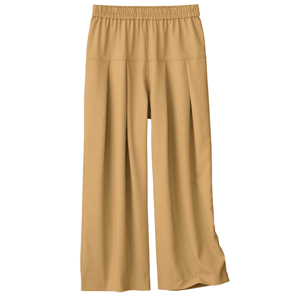 シャリっとした清涼感ある素材で、キュロットの様に着られるパンツです。暑い時期に涼しく過ごせそうな素材とゆとり感です。Mサイズが良いです。腰に切り替えがあるのでウエスト廻りはスッキリめ、ヒップ~わたりはゆとりがしっかりある楽パンです。