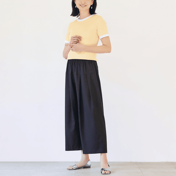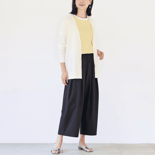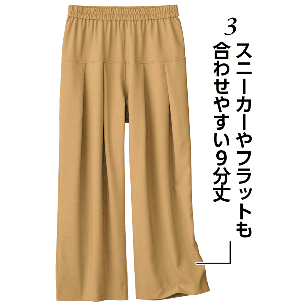 脚のラインをひろわないすっきり見えする、高品質の日本製ワイドパンツ。軽くてドライな肌ざわりとゆったりとしたシルエットで涼やかなはき心地です。スニーカーやフラットシューズも合わせやすい9分丈。