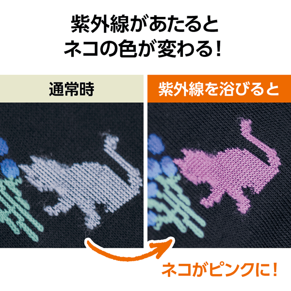 - ネコ柄が紫外線にあたると、特殊繊維によりホワイトからピンクに変わります。