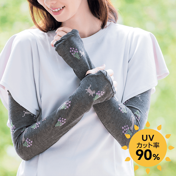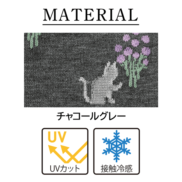 腕の内側がひんやり冷感素材で快適な、二の腕までしっかりカバーできるロング丈のアームカバー。紫外線にあたると特殊繊維を使用したネコ柄の色が変わるので、紫外線のチェックができます。