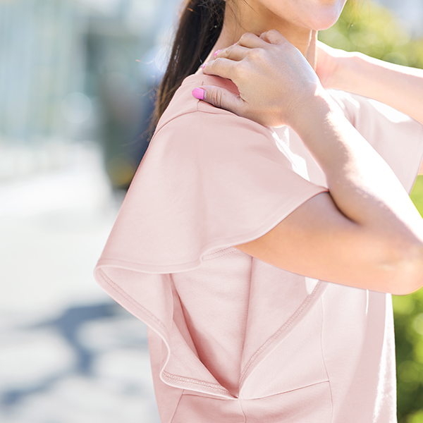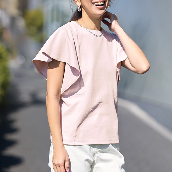 ほどよい厚みのあるTシャツ生地で伸縮性があり、着脱しやすいです。既存商品の「バタフライスリーブカットソー」と似ていますが透け防止・UVカットの機能が付いるのも嬉しいです、スカートにもパンツにも合わせやすい万能カットソーです。